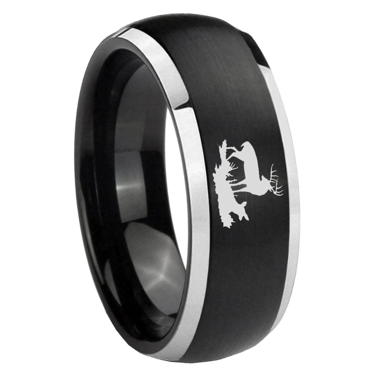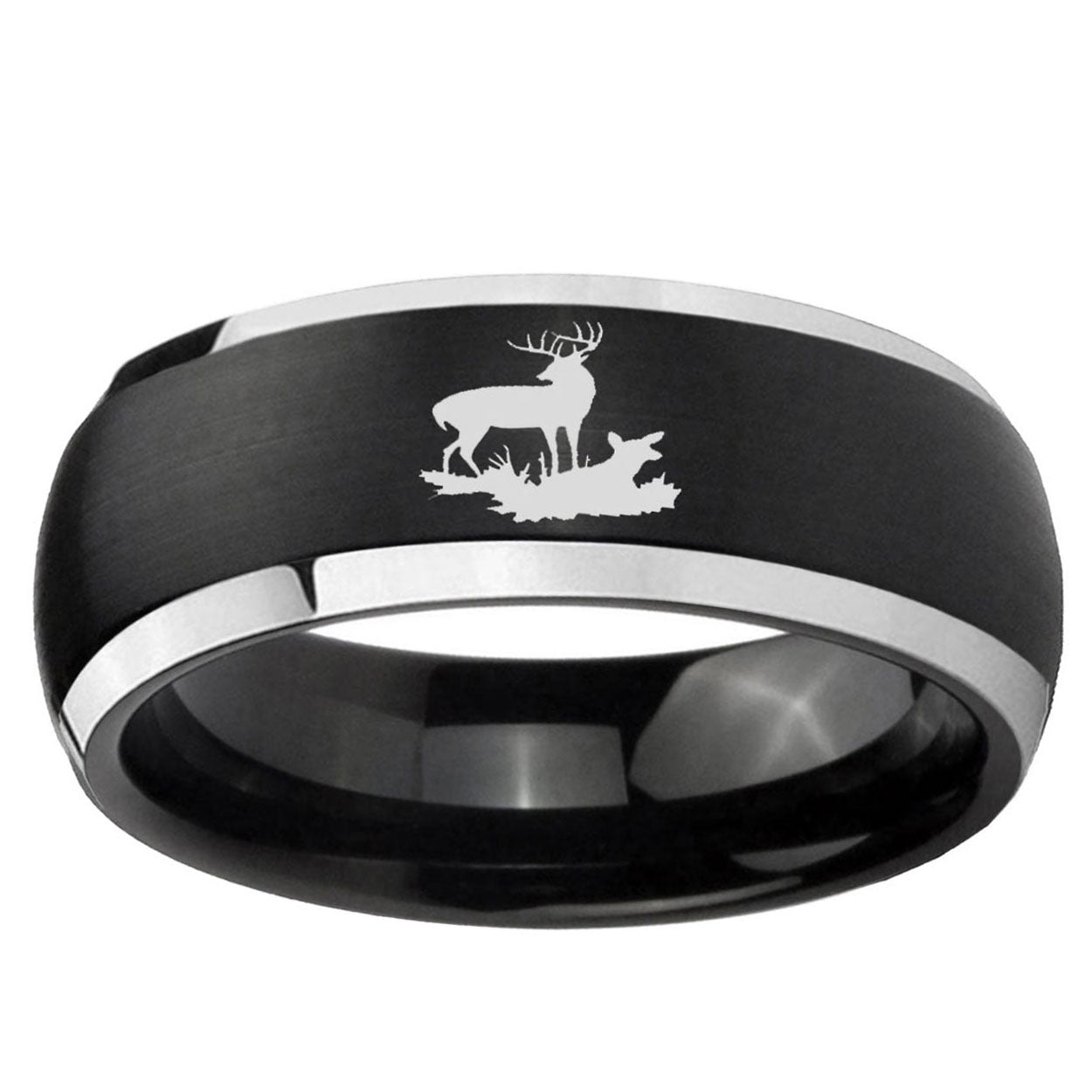 Intruding 5, 8mm Deer Hunting Dome Brushed Black 2 Tone Tungsten Carbide Engagement Ring . Offer in both 5mm and 8mm band width brushed black plated finished from size 4 to 14