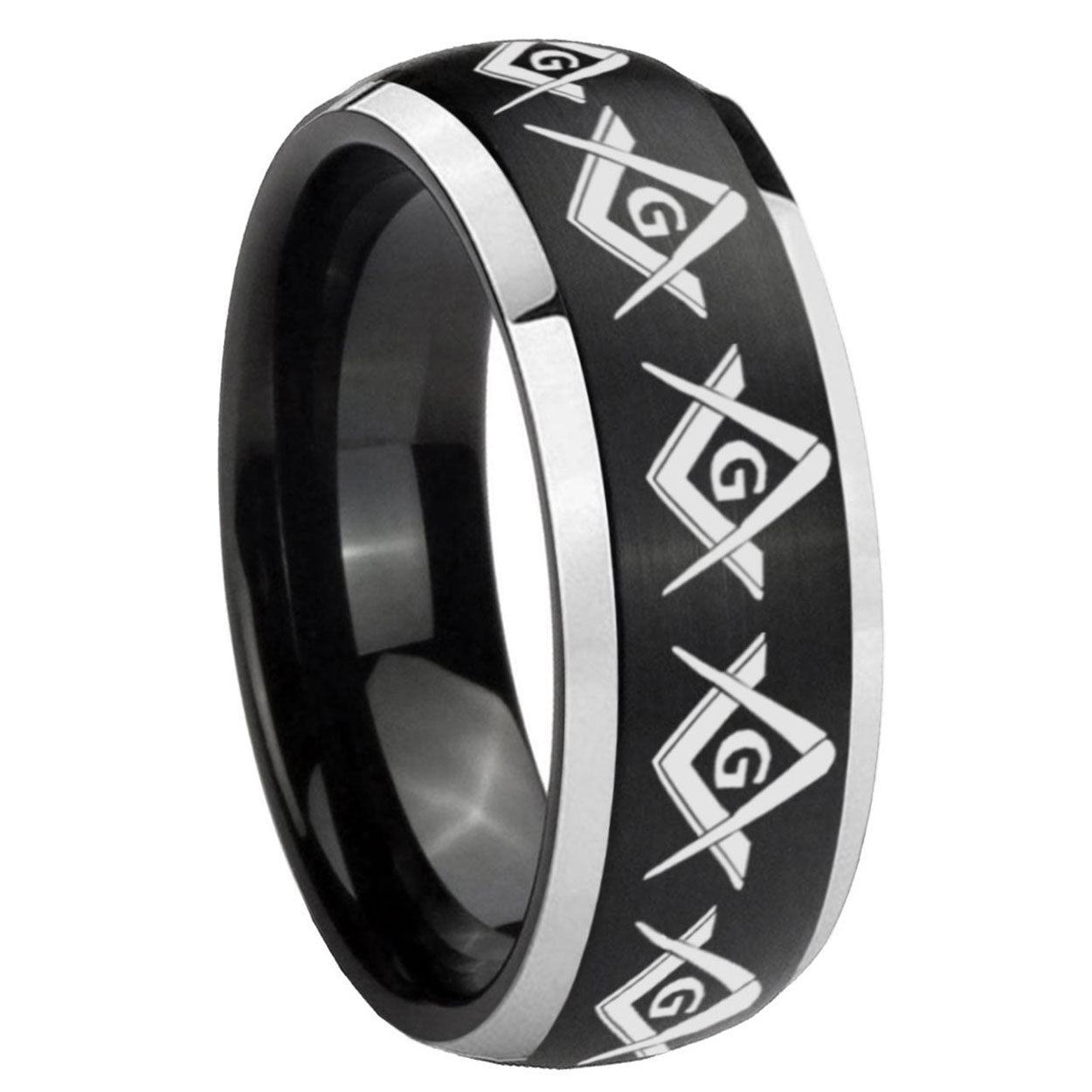 5, 8mm Masonic Square and Compass Dome Brushed Black 2 Tone Tungsten Custom Mens Ring