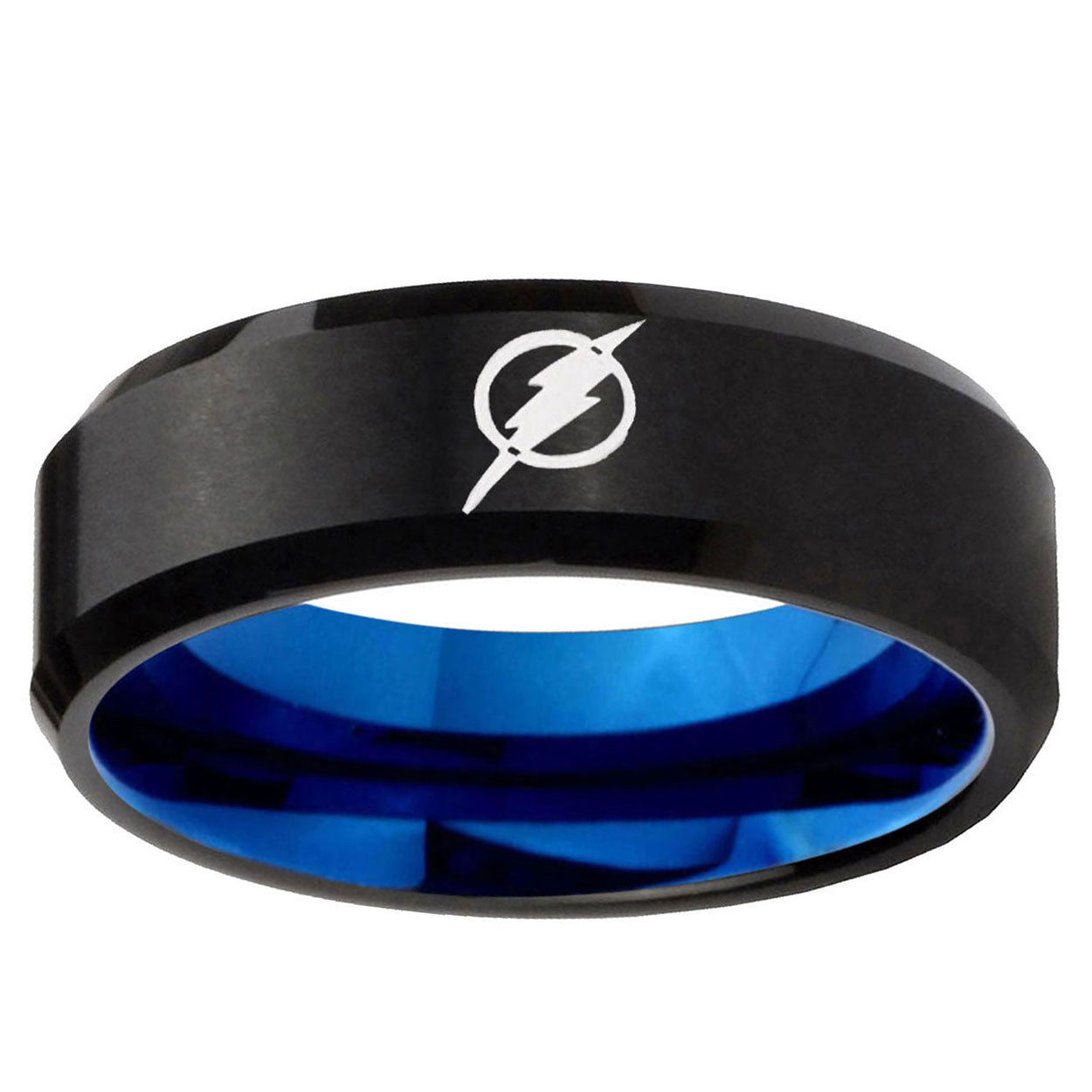 Intruding 5, 8mm Flash Beveled Edge Blue Black Tungsten Ring . Offer in both 5mm and 8mm band width black and blue plated finished from size 4 to 14