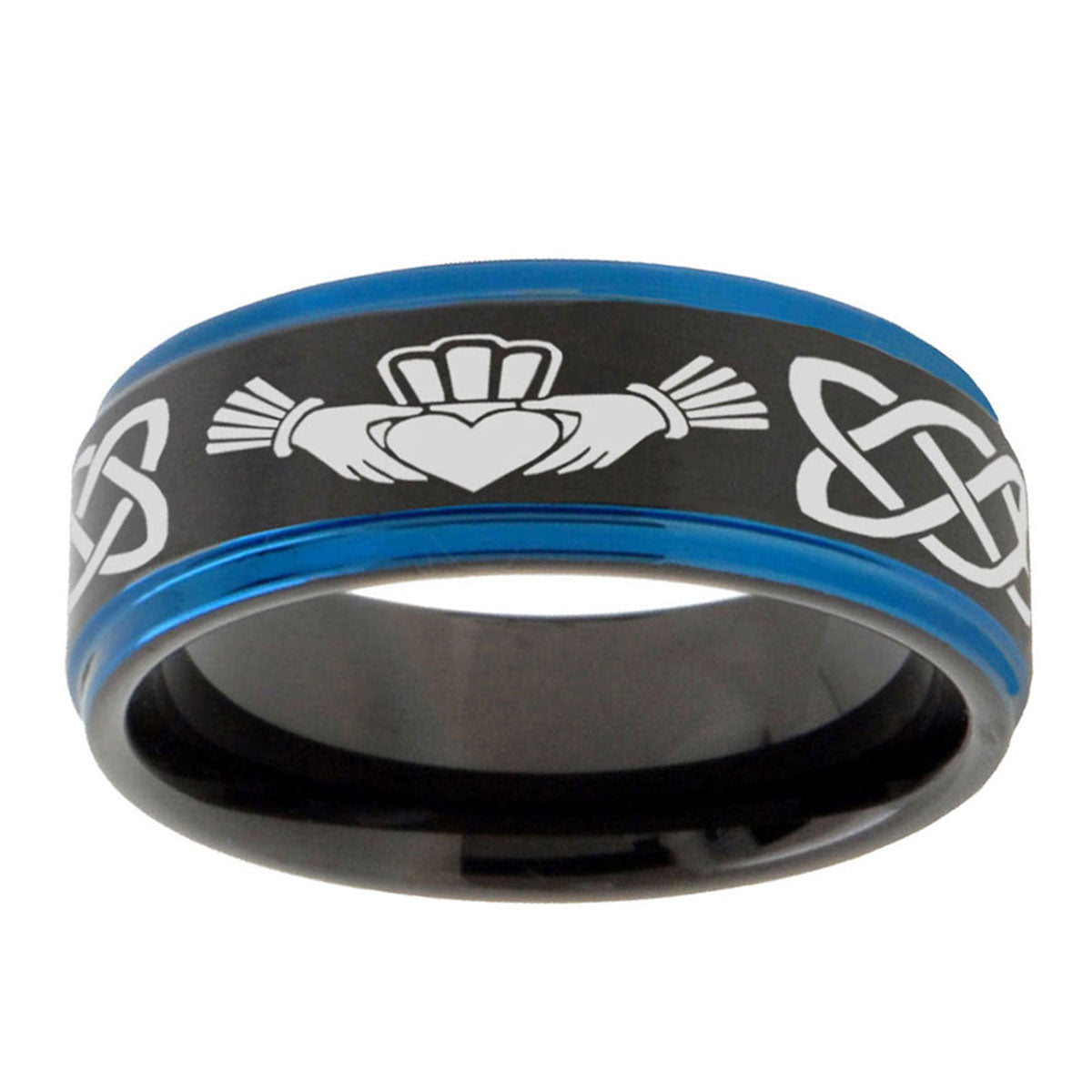 Introuding 5, 8mm Irish Claddagh Blue Step Edges Tungsten Carbide Mens Wedding Ring . Offer in both 5mm and 8mm band width black and blue plated finished from size 4 to 14