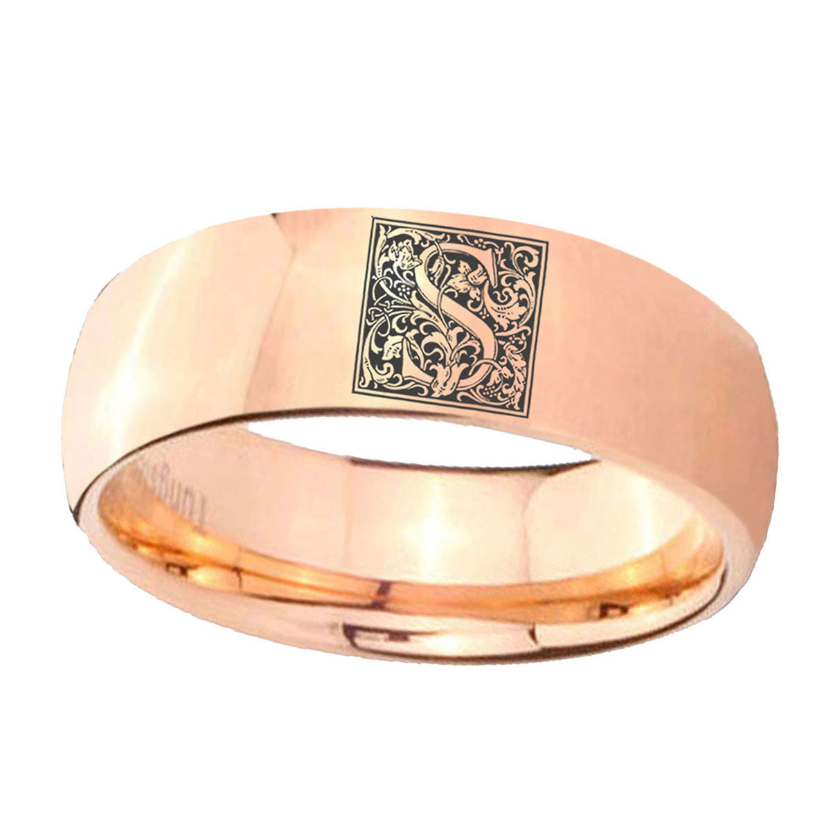 This classic dome tungsten carbide ring in rose gold color with Monogram Floral Initial Letter S engraved on it.