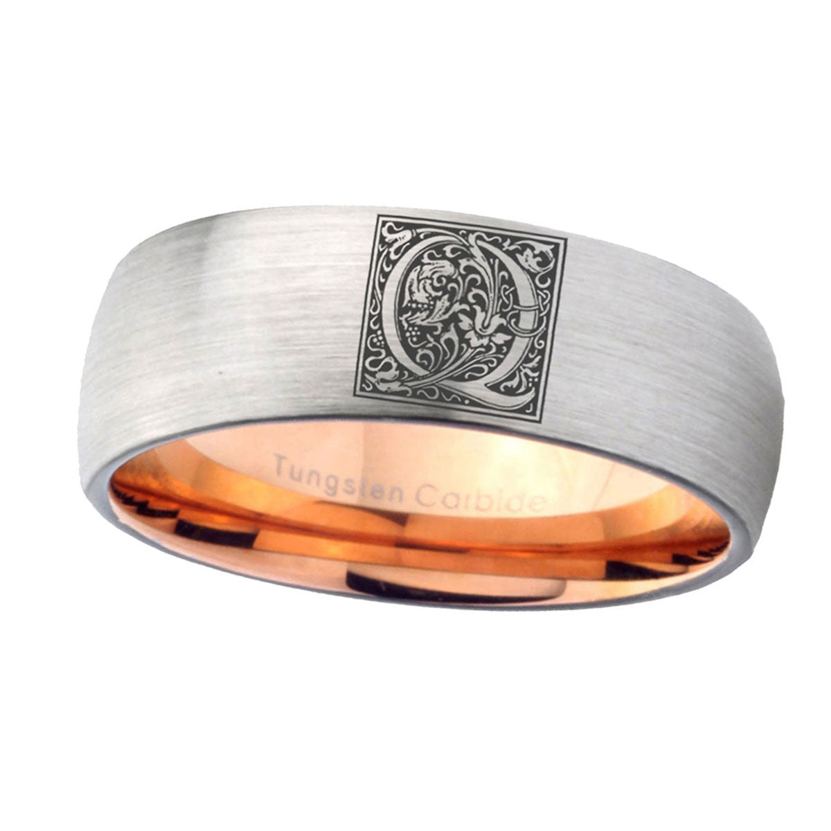 This classic dome tungsten carbide ring in gray and rose gold color with Monogram Floral Initial Letter Q engraved on it.