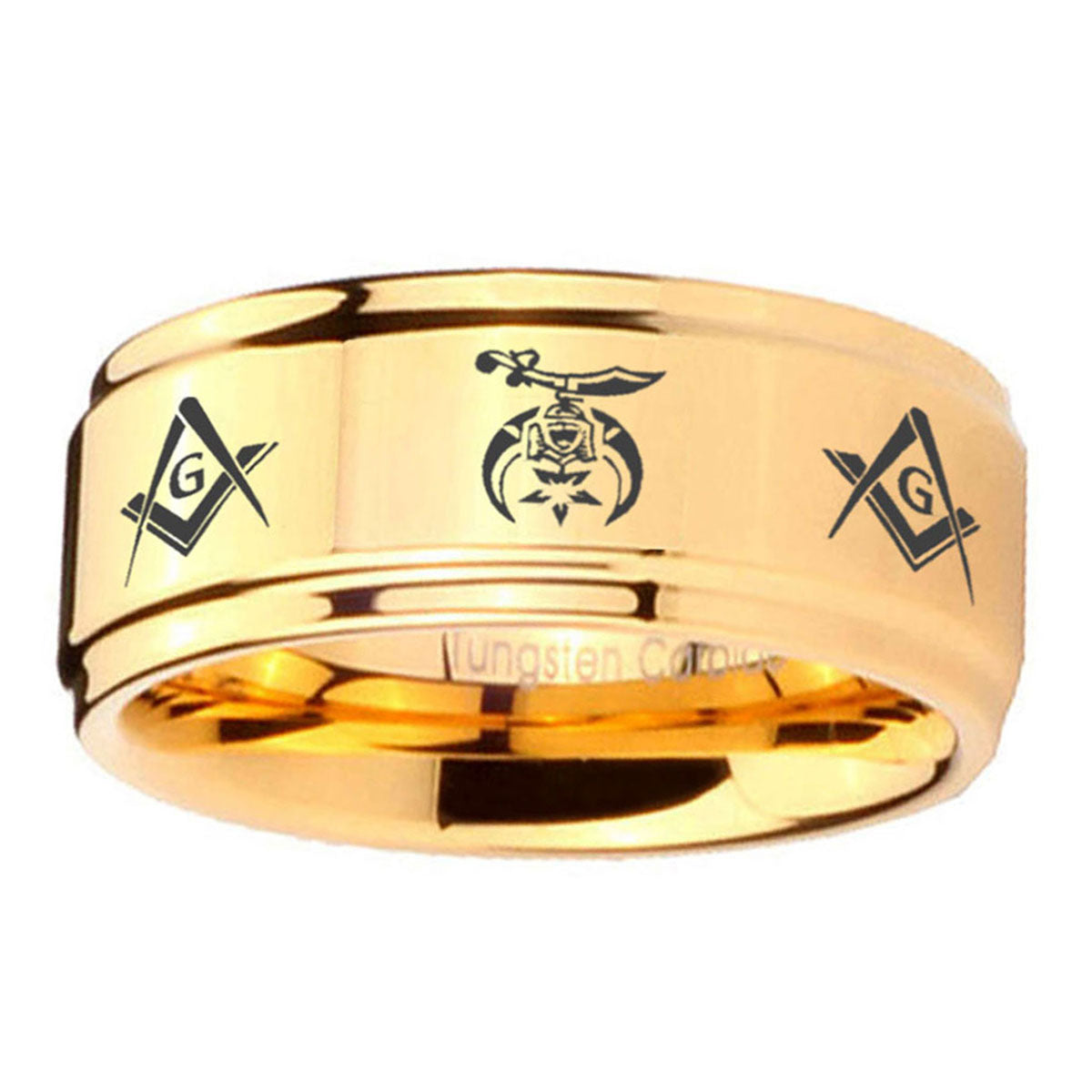 Introuding 5, 8mm Masonic Shriners Step Edge Gold Engraved Wedding Bands For Him . Offer in both 5mm and 8mm band width 18k gold plated finished from size 4 to 14