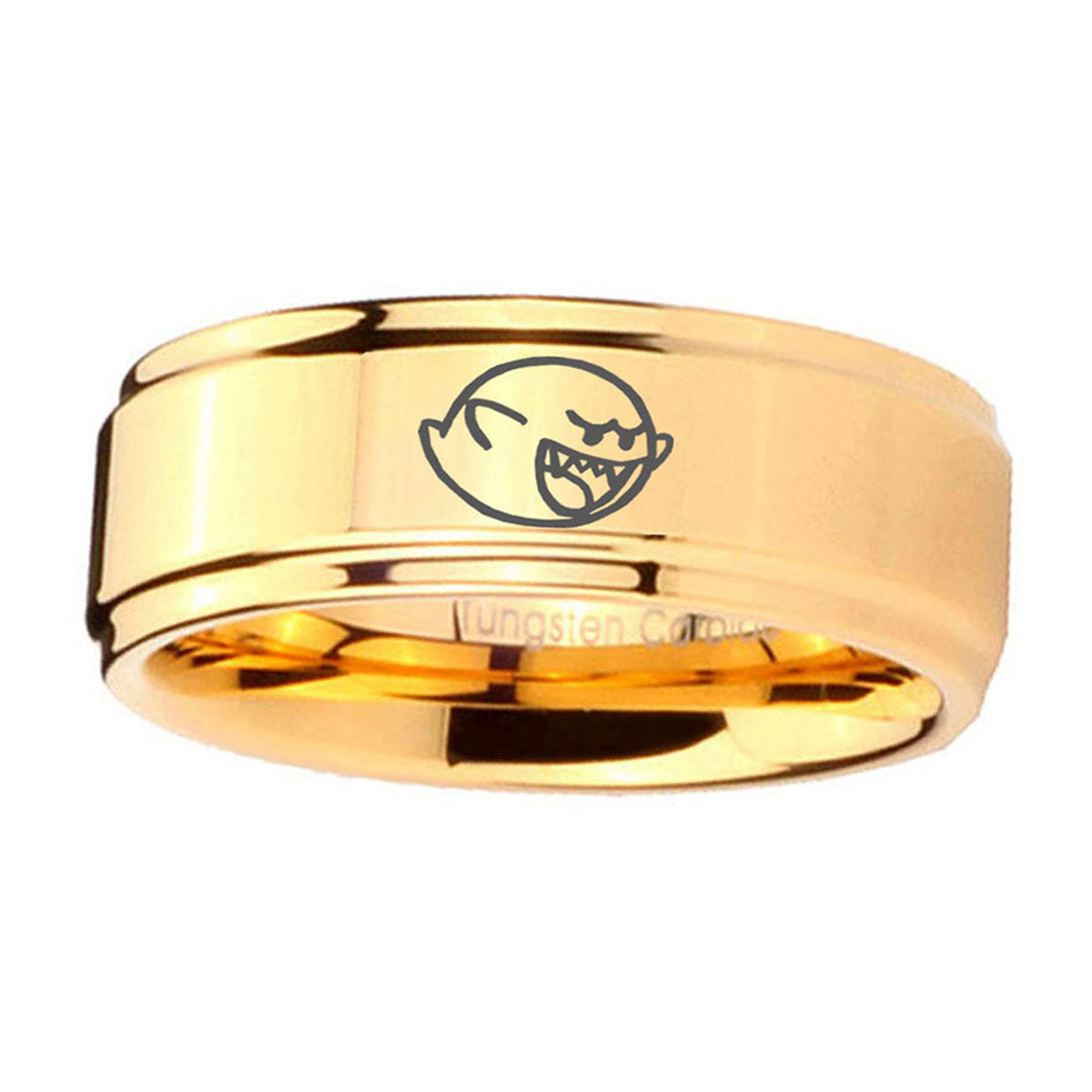 5, 8mm Mario Boo Ghost Step Edge Gold Engraved Tungsten Rings
