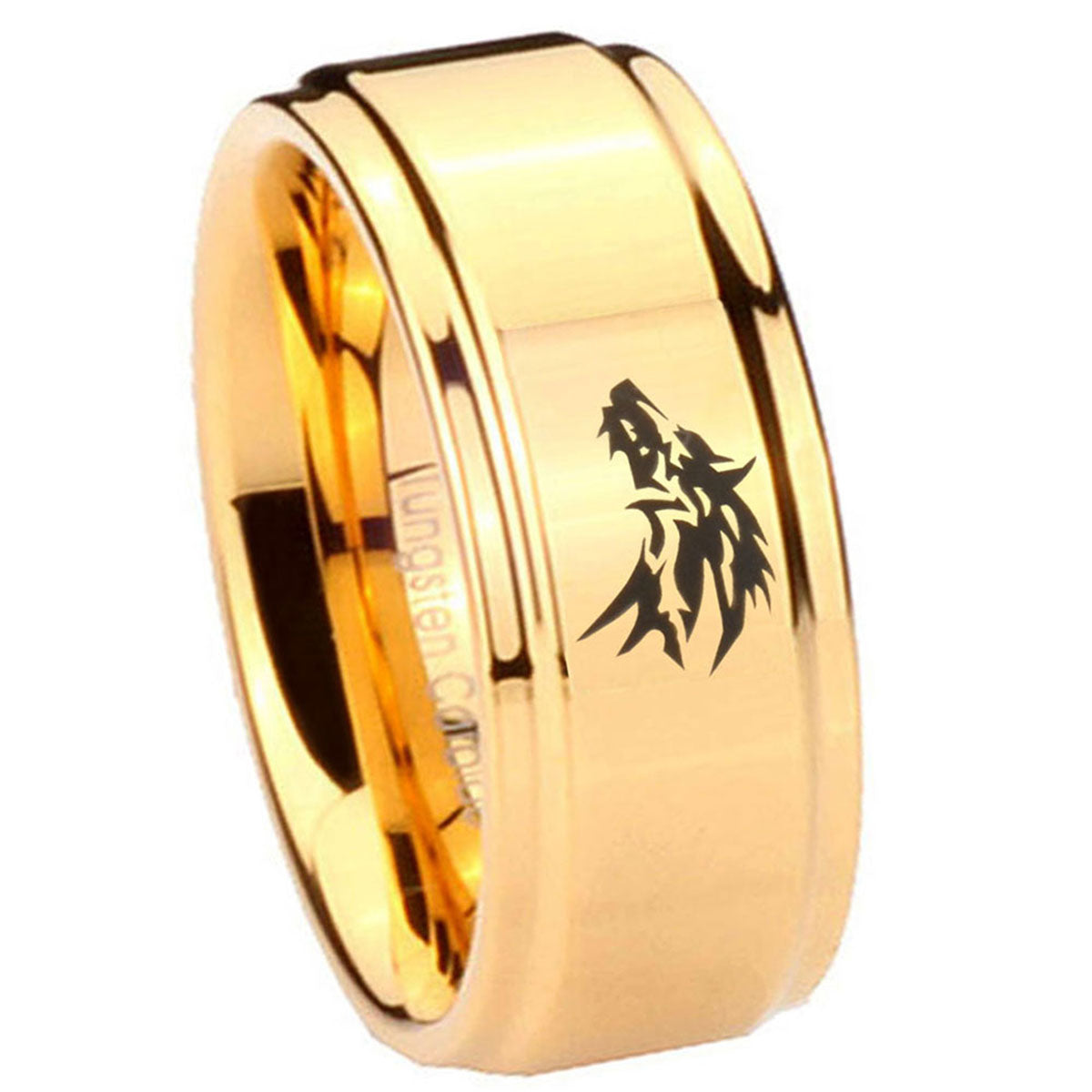 Introuding 5, 8mm Wolf Step Edge Gold Mens Ring Tungsten . Offer in both 5mm and 8mm band width 18k gold plated finished from size 4 to 14