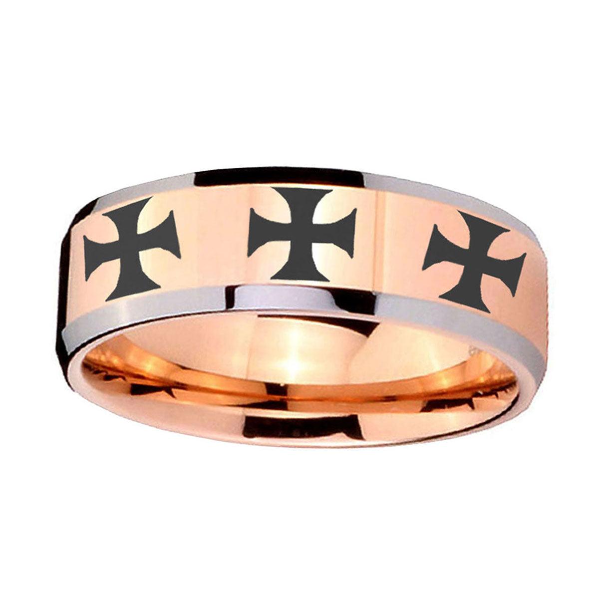 Introuding 5, 8mm Multiple Maltese Cross Beveled Rose Gold Tungsten Mens Anniversary Ring . Offer in both 5mm and 8mm band width rose gold two tone finished from size 4 to 14