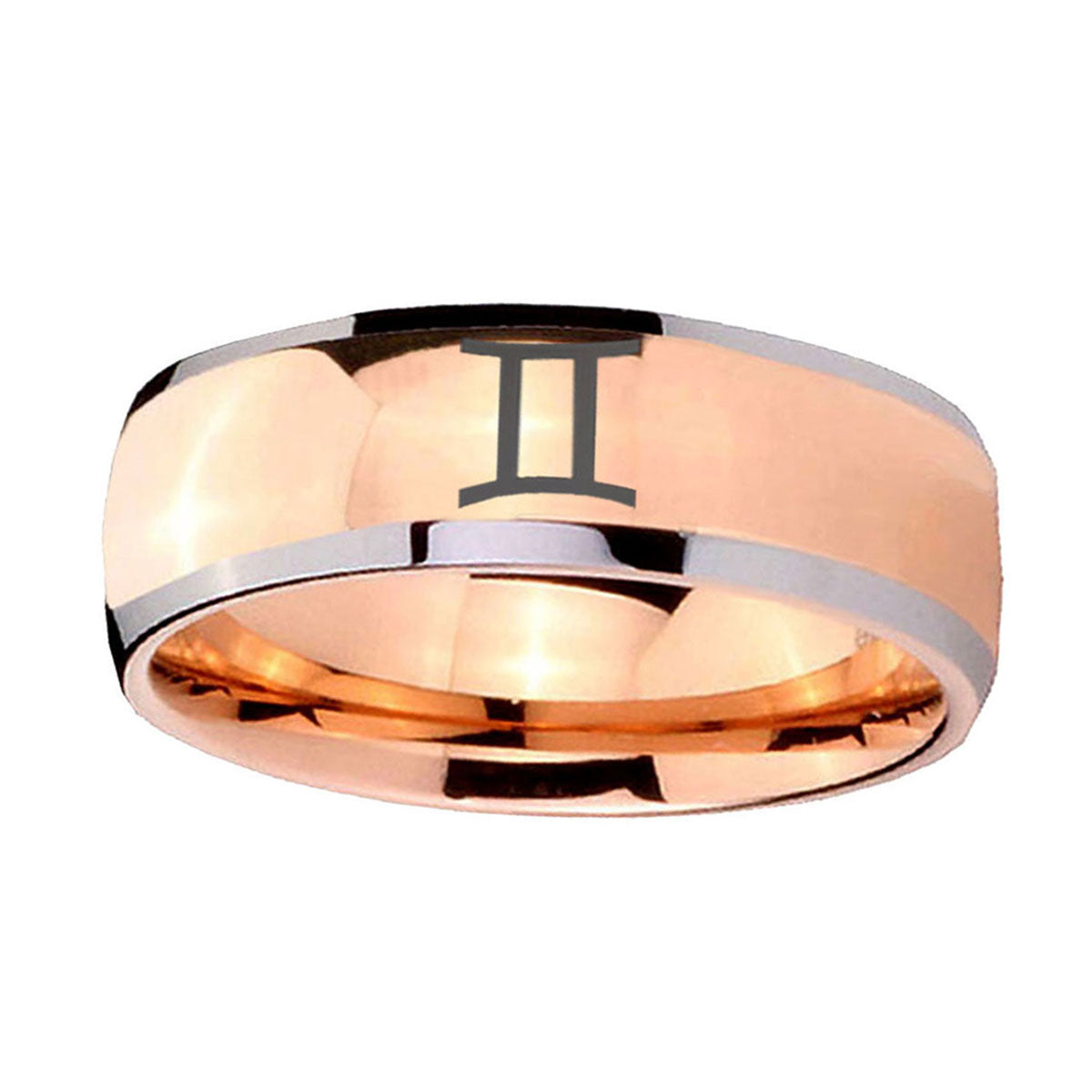 Introuding 5, 8mm Gemini Zodiac Dome Rose Gold Tungsten Carbide Wedding Engraving Ring . Offer in both 5mm and 8mm band width two tone rose gold plated fnished from size 4 to 14