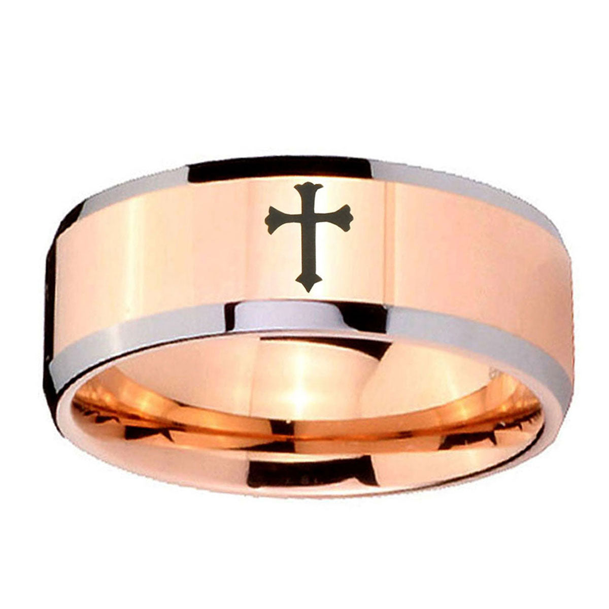 Introuding 5, 8mm Flat Christian Cross Beveled Edges Rose Gold Tungsten Mens Engagement Ring . Offer in both 5mm and 8mm band width rose gold two tone finished from size 4 to 14