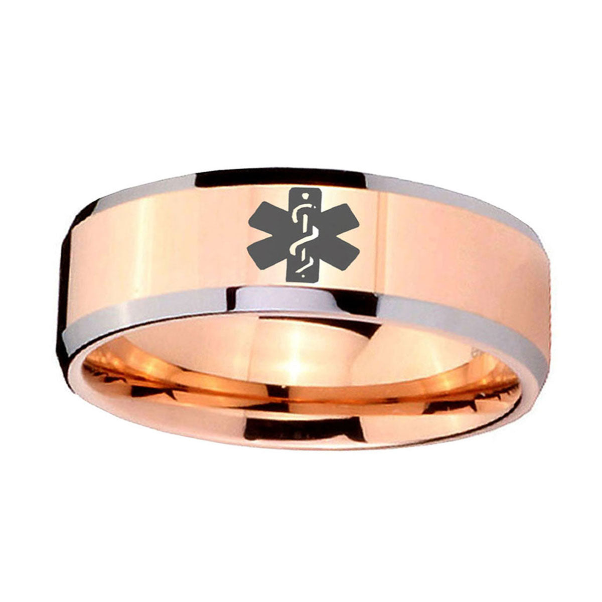 Introuding 5, 8mm Medical Alert Beveled Edges Rose Gold Tungsten Carbide Mens Wedding Band . Offer in both 5mm and 8mm band width rose gold two tone finished from size 4 to 14