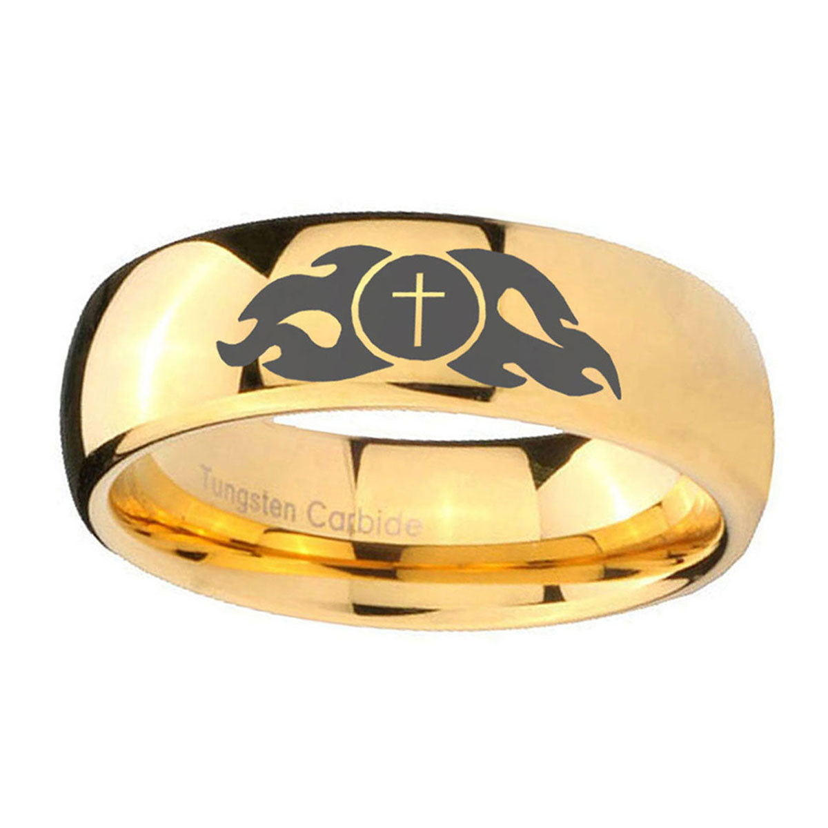 5, 8mm Flamed Cross Dome Gold Tungsten Carbide Mens Wedding Band