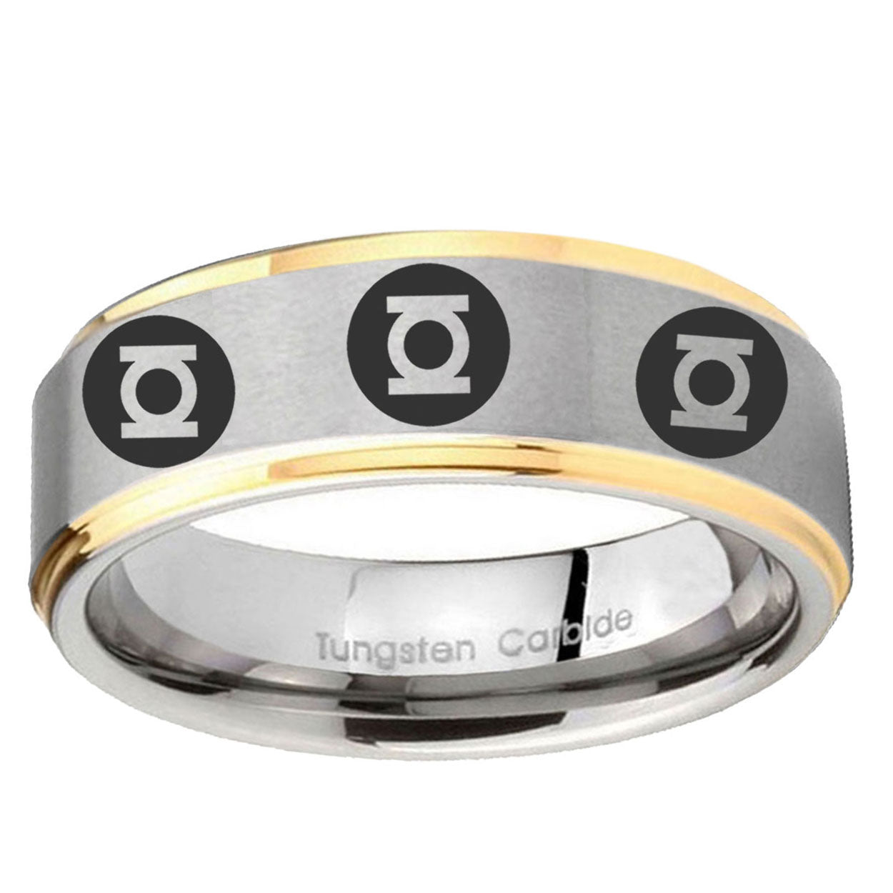 Intruding 5, 8mm Multiple Green Lantern Step Edge Gold and Gray Best Man Gift . Offer in both 5mm and 8mm band width brushed grey and gold finished from size 4 to 14
