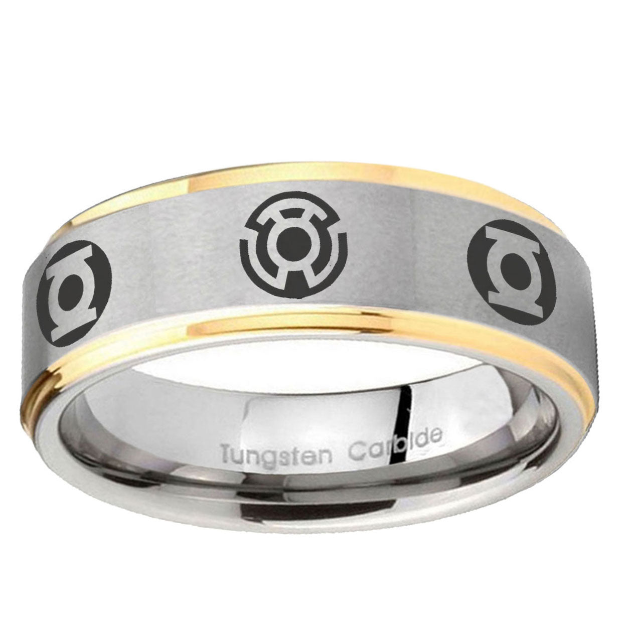 Intruding 5, 8mm Blue Green Lantern Step Edge Gold and Gray Ring Silver Wedding . Offer in both 5mm and 8mm band width brushed grey and gold finished from size 4 to 14
