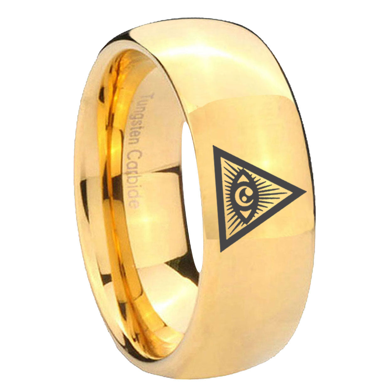 Intruding 5, 8mm Seeing Eye of God Dome Polish Gold Men's Tungsten Ring . Offer in both 5mm and 8mm band width 18k gold plated finished from size 4 to 14