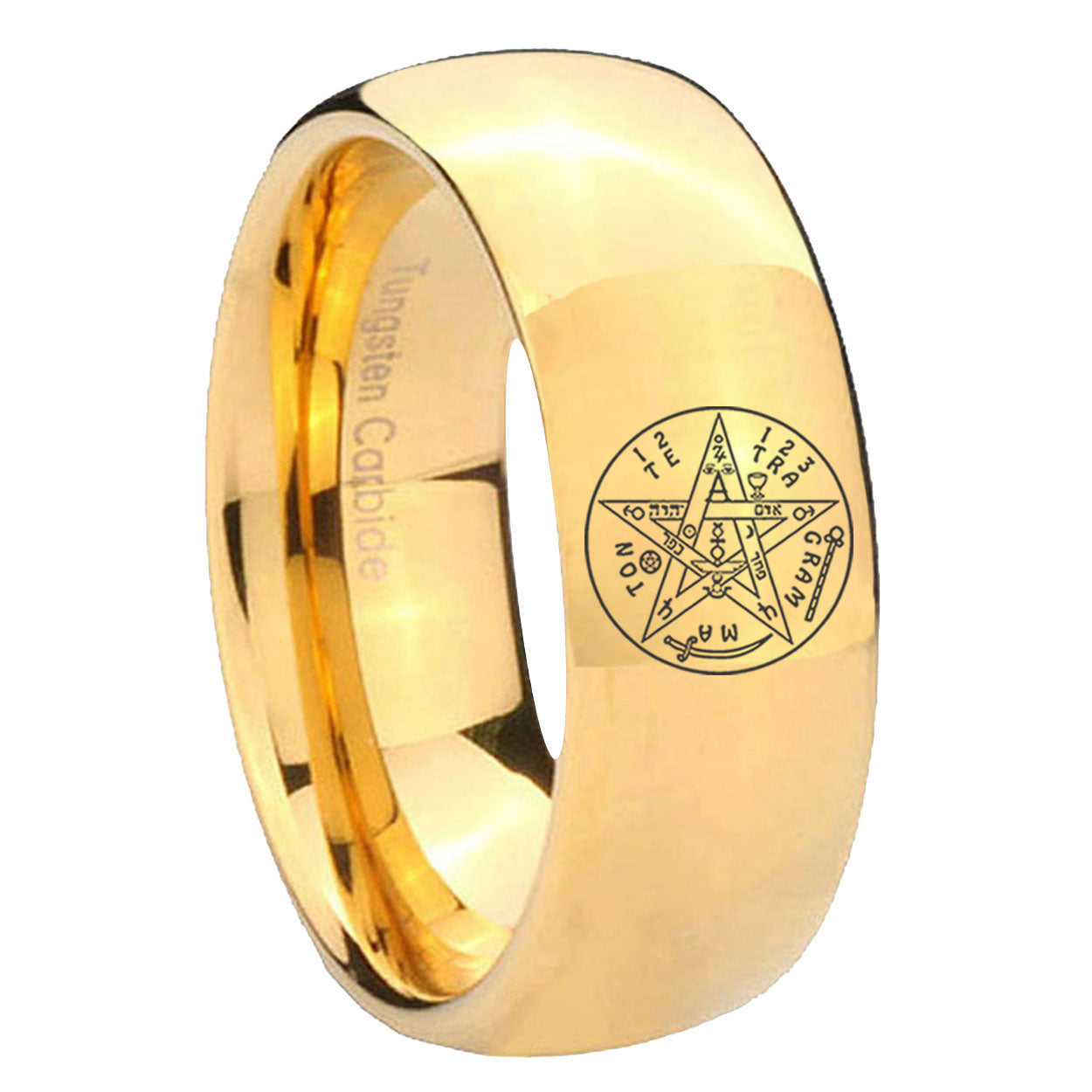 Intruding 5, 8mm Tetragrammaton Spiritual Kabbalah Dome Polish Gold Men's Tungsten Ring . Offer in both 5mm and 8mm band width 18k gold plated finished from size 4 to 14