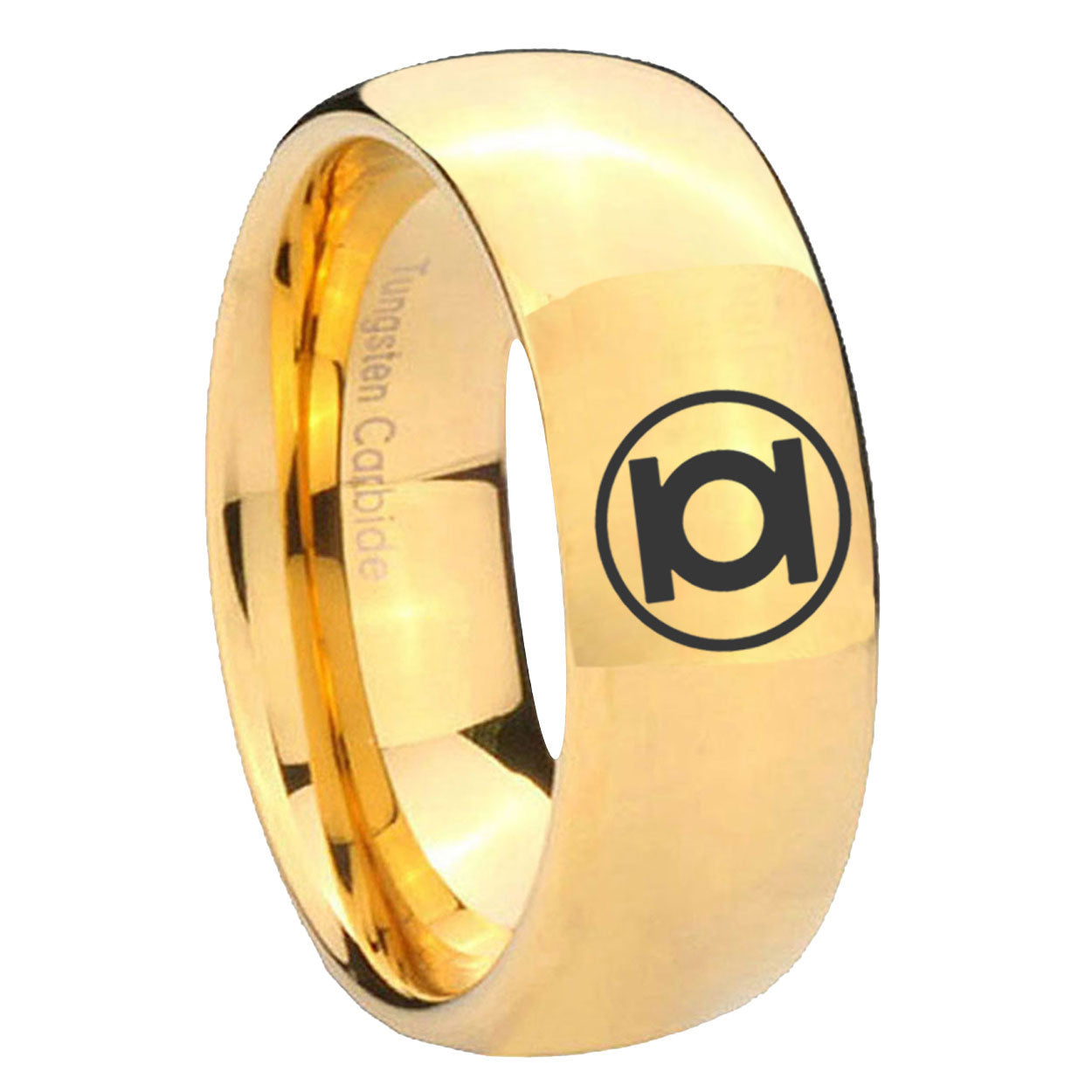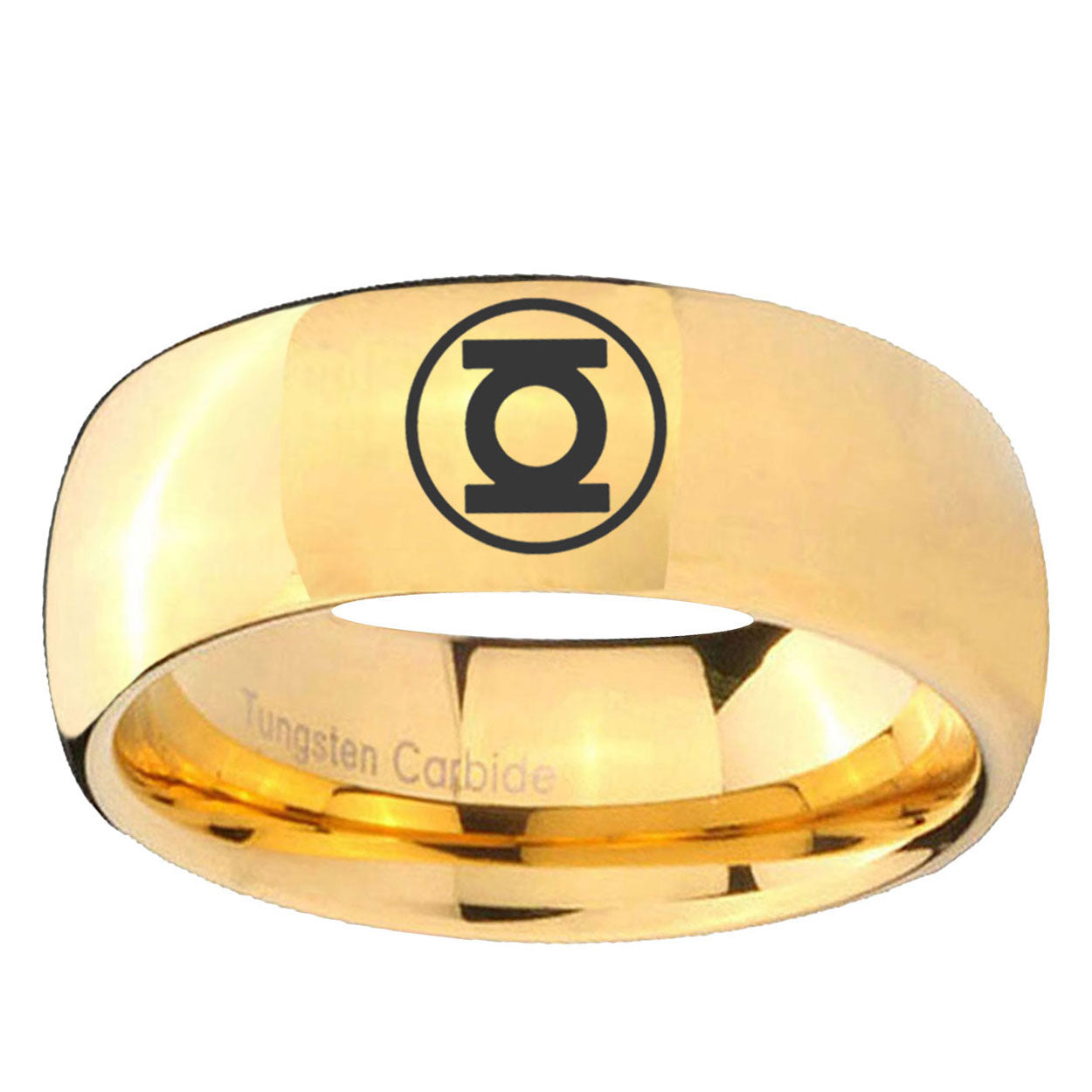 Intruding 5, 8mm Green Lantern Dome Polish Gold Men's Tungsten Ring . Offer in both 5mm and 8mm band width 18k gold plated finished from size 4 to 14