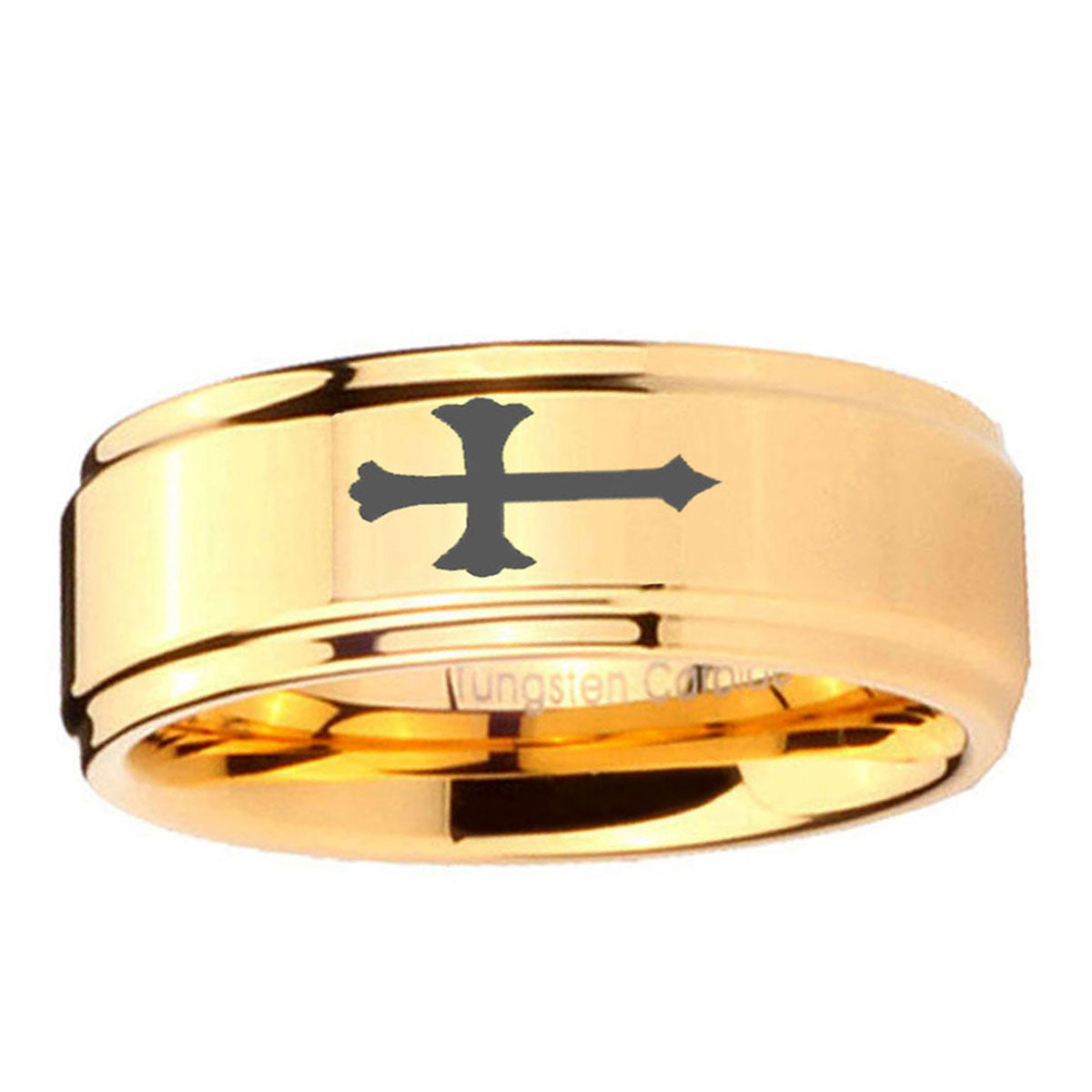5, 8mm Crosses Step Edge Gold Mens Ring Tungsten