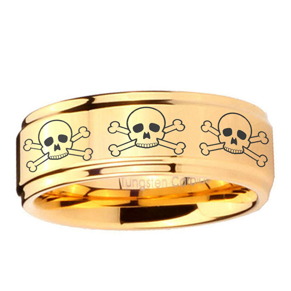 Intruding 5, 8mm Multiple Skull Step Edge Gold Tungsten Engagement Rings For Him . Offer in both 5mm and 8mm band width 18k gold plated finished from size 4 to 14