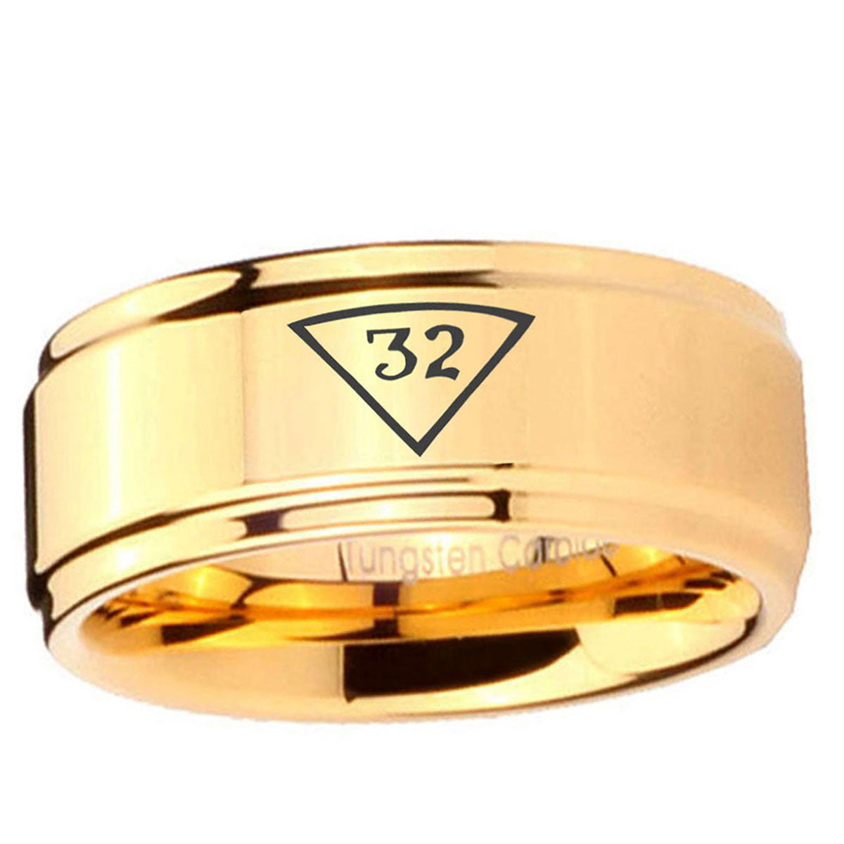 Intruding 5, 8mm 32 Masonic Step Edge Gold Tungsten Engagement Rings For Him . Offer in both 5mm and 8mm band width 18k gold plated finished from size 4 to 14