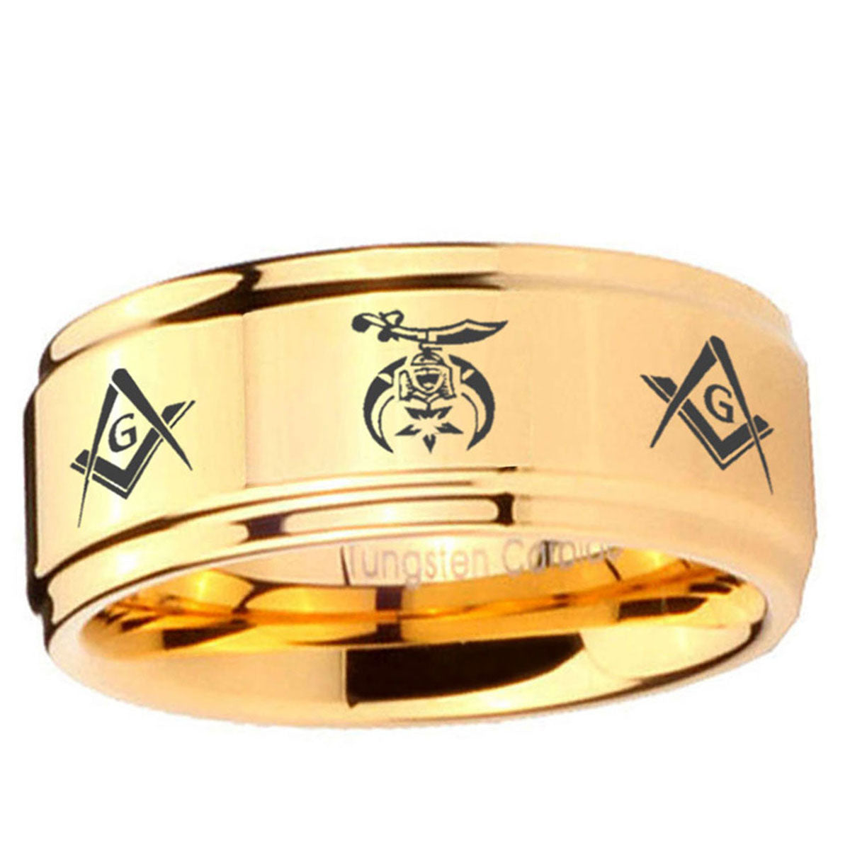 Intruding 5, 8mm Masonic Shriners Step Edge Gold Engraved Wedding Bands For Him . Offer in both 5mm and 8mm band width 18k gold plated finished from size 4 to 14