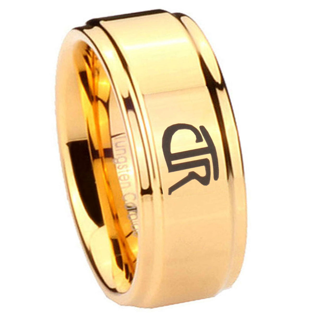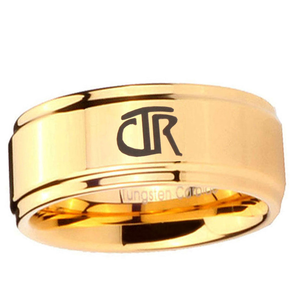Intruding 5, 8mm CTR Step Edge Gold Engraved Wedding Bands For Him . Offer in both 5mm and 8mm band width 18k gold plated finished from size 4 to 14