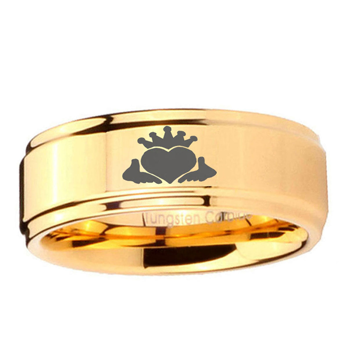 5, 8mm Claddagh Step Edge Gold Tungsten Engagement Rings For Him