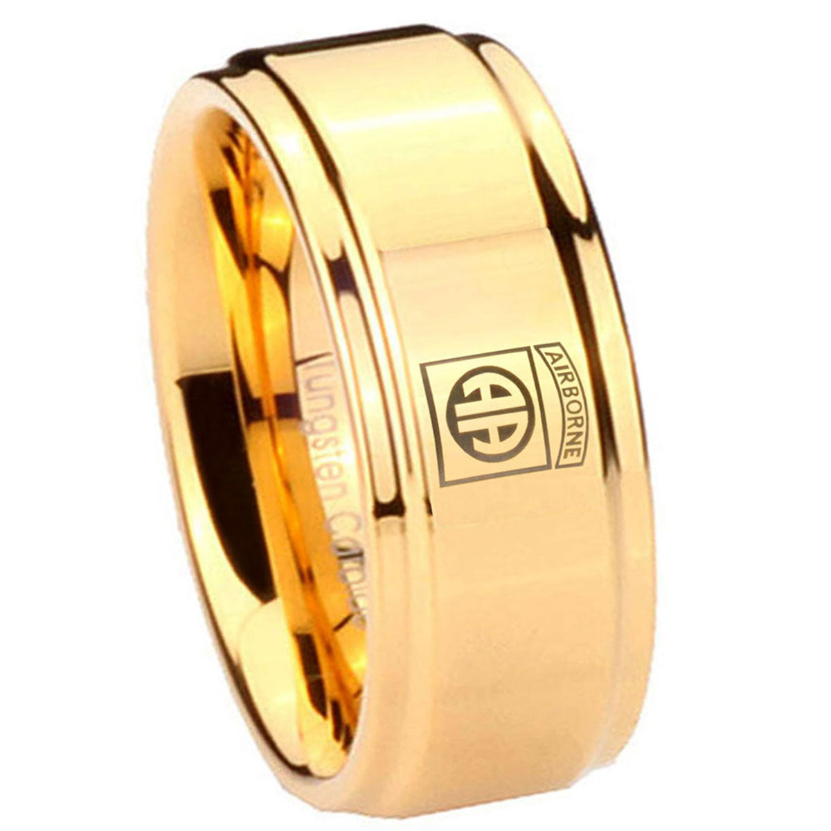Intruding 5, 8mm Army Airborne Step Edge Gold Tungsten Engagement Rings For Him . Offer in both 5mm and 8mm band width 18k gold plated finished from size 4 to 14