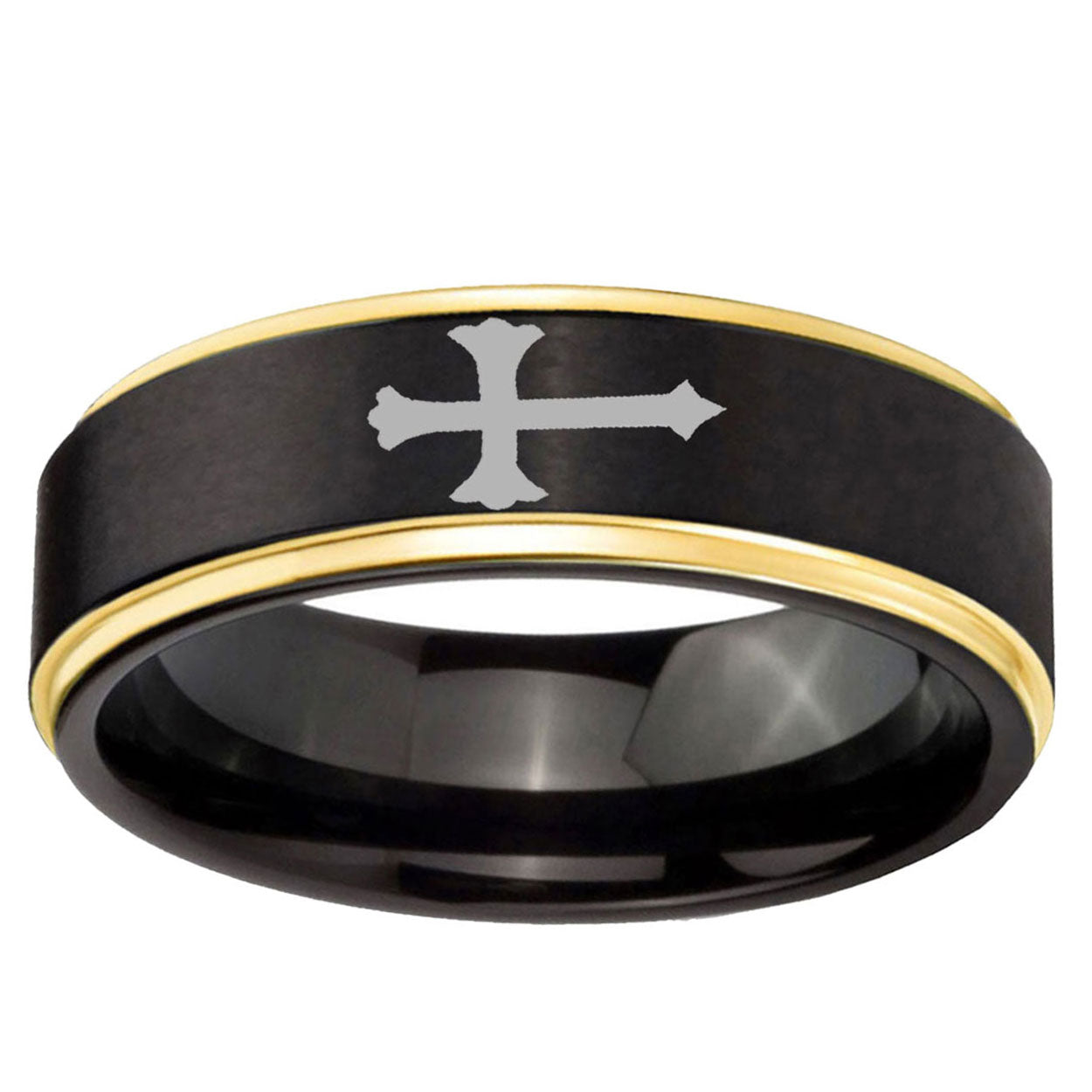 Intruding 6, 8mm Christian Cross Gold Step Edge Black Tungsten Mens Engagement Band . Offer in both 6mm and 8mm band width black plated finished from size 5 to 14