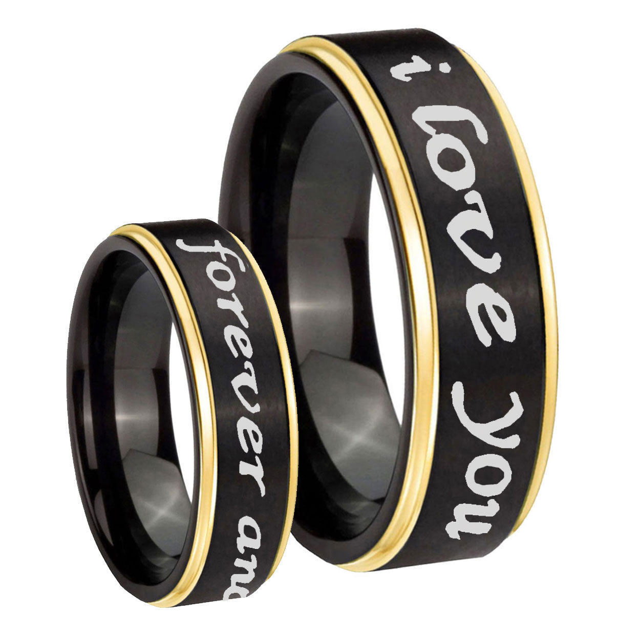 Intruding 6, 8mm I Love You Forever and ever Gold Step Edge Black Tungsten Men's Ring . Offer in both 6mm and 8mm band width black plated finished from size 5 to 14