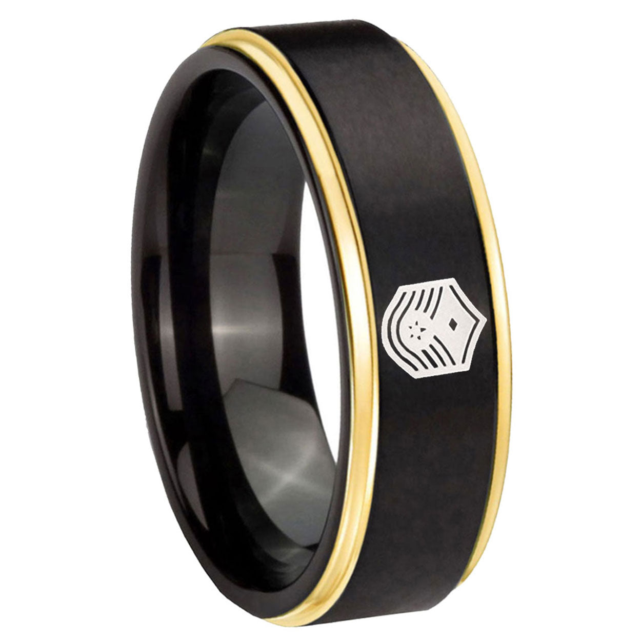 Intruding 6, 8mm Chief Master Sergeant Vector Gold Step Edge Black Tungsten Engagement Ring . Offer in both 6mm and 8mm band width black plated finished from size 5 to 14