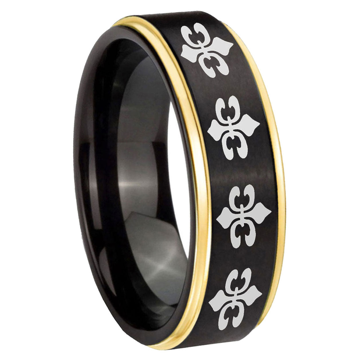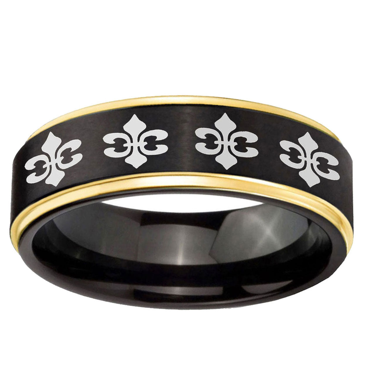 6, 8mm Multiple Fleur-De-Lis Gold Step Edge Black Tungsten Men's Band Ring