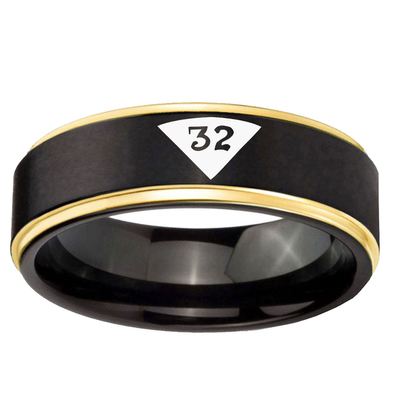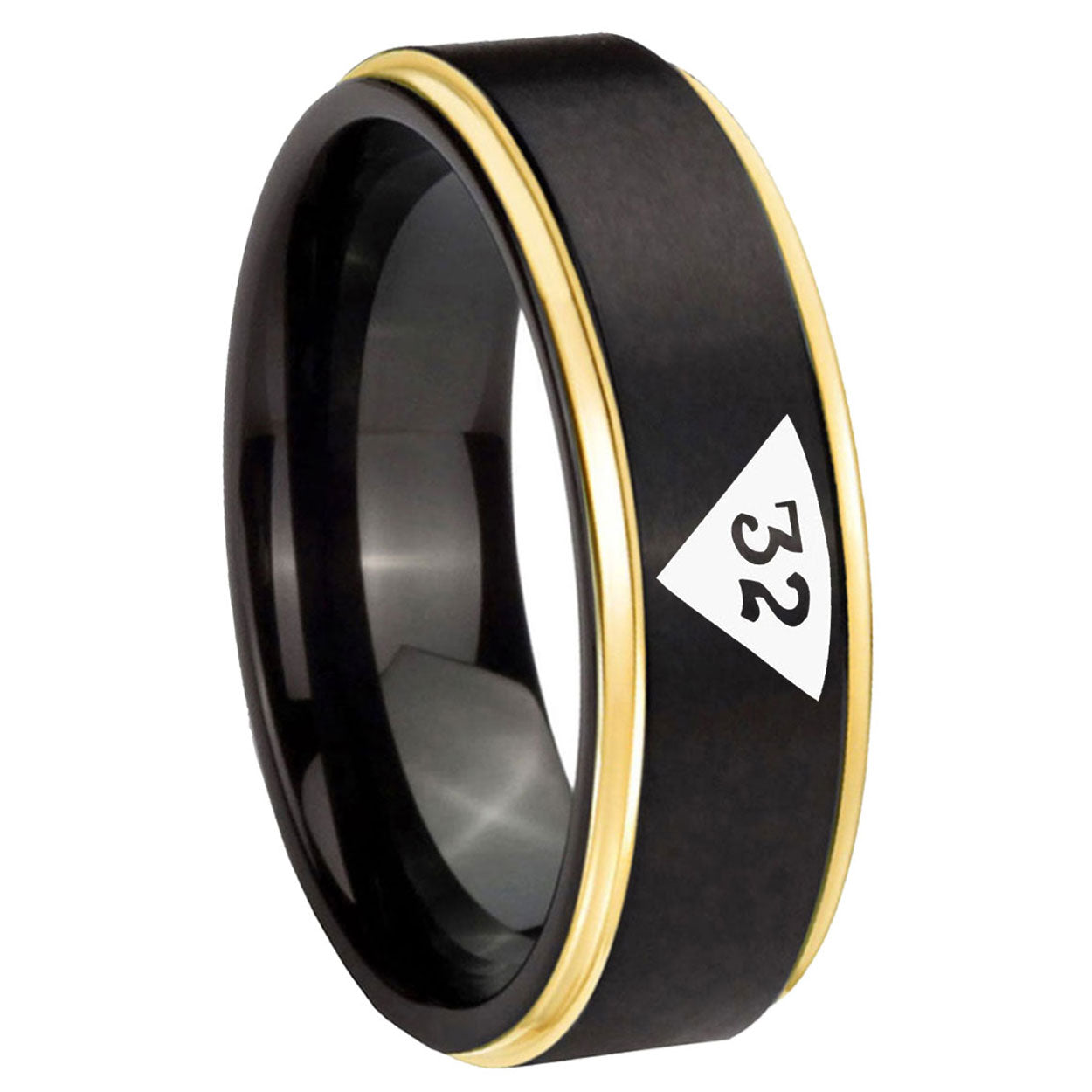 6, 8mm Masonic 32 Triangle Design Freemason Gold Step Edge Black Tungsten Carbide Custom Men's Ring