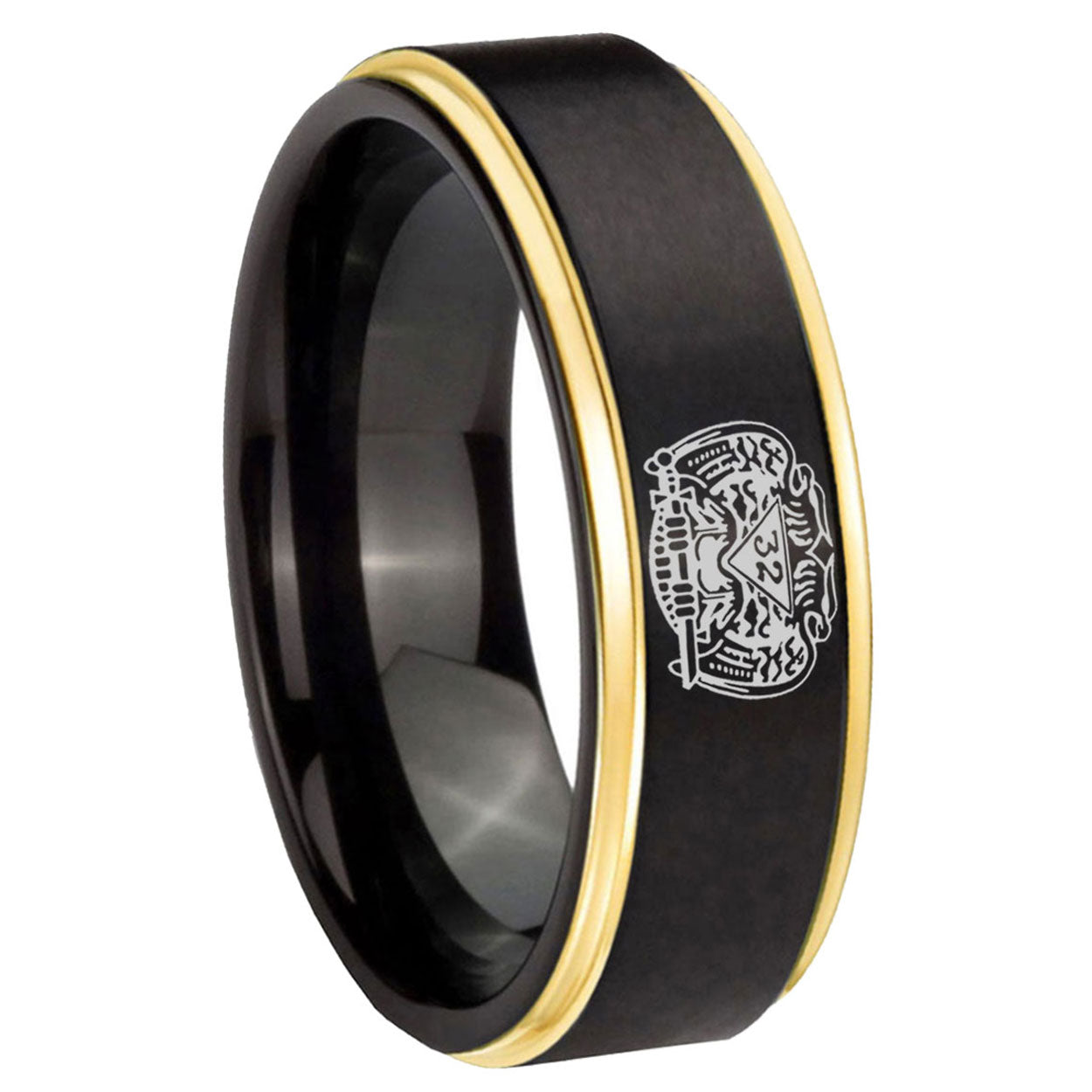 6, 8mm Masonic 32 Degree Freemason Gold Step Edge Black Tungsten Carbide Custom Men's Ring