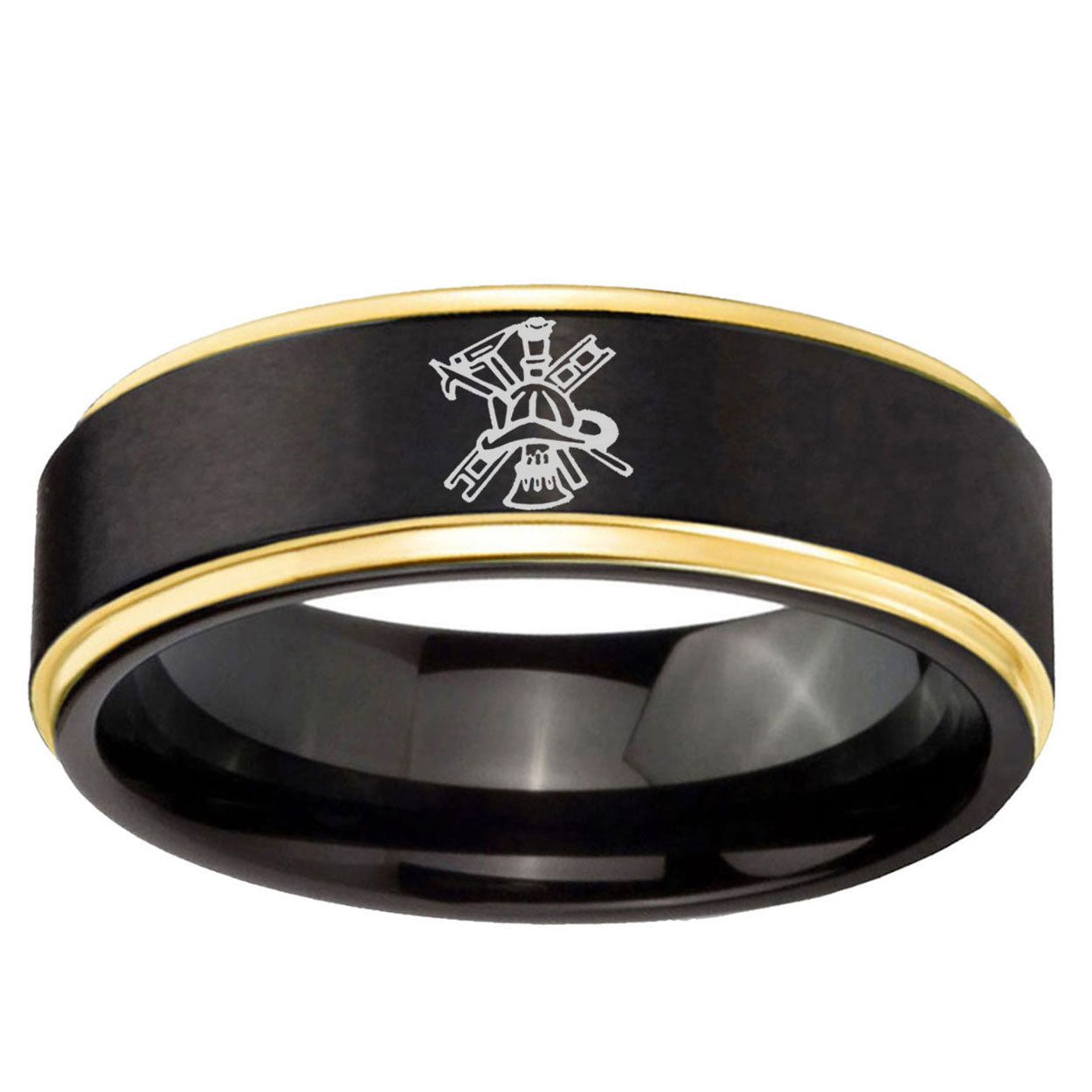 Intruding 6, 8mm Fireman Gold Step Edge Black Tungsten Carbide Men's Promise Rings . Offer in both 6mm and 8mm band width black plated finished from size 5 to 14