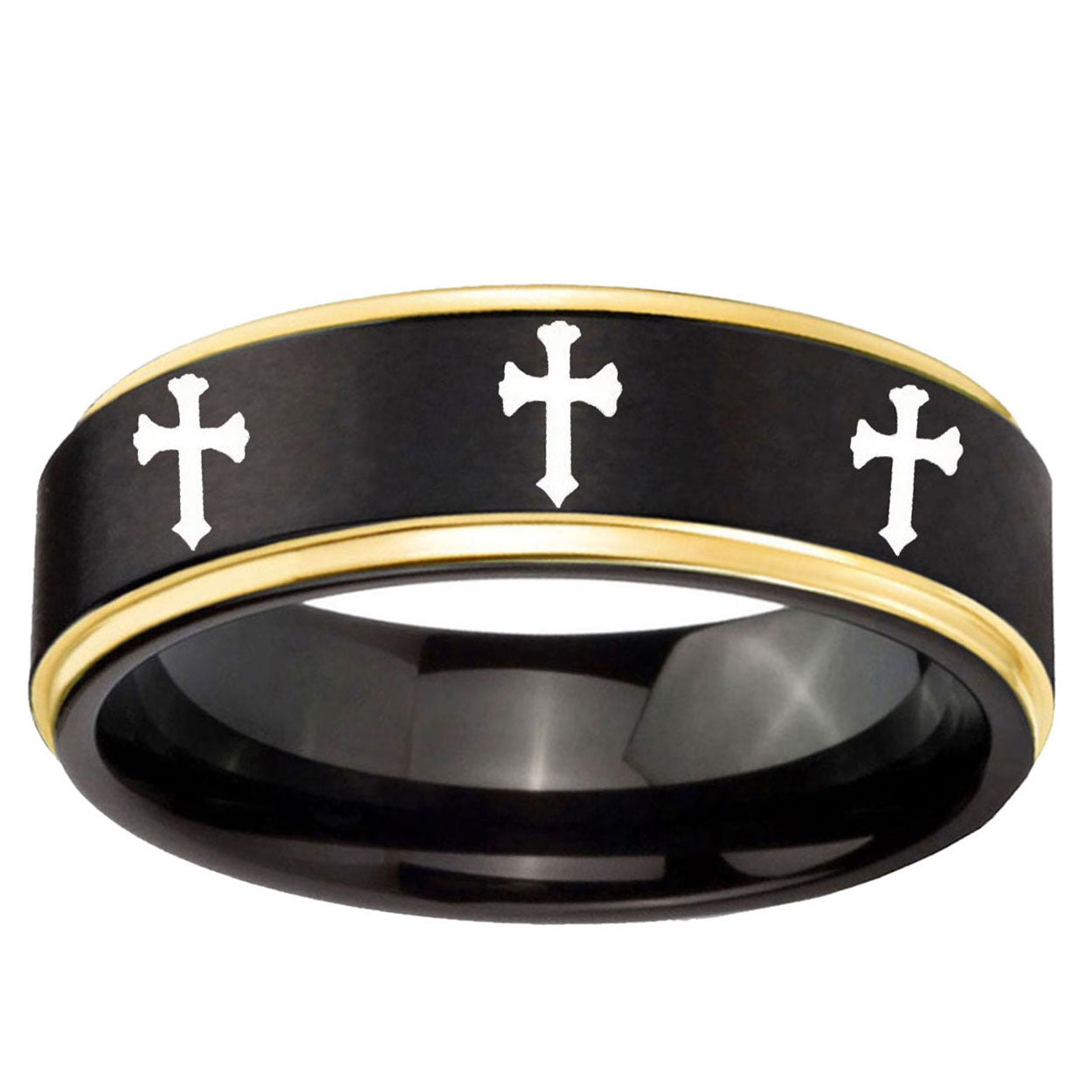 Intruding 6, 8mm Multiple Christian Cross Gold Step Edge Black Tungsten Wedding Bands Ring . Offer in both 6mm and 8mm band width black plated finished from size 5 to 14