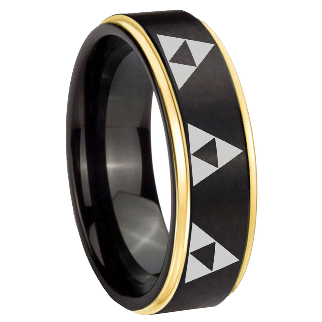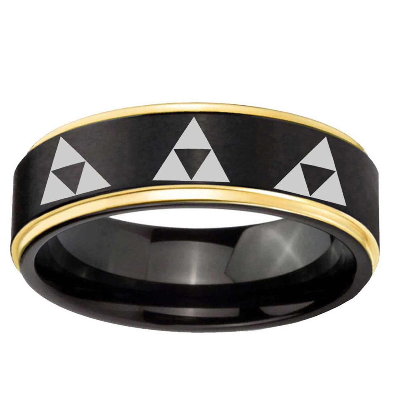 Intruding 6, 8mm Multiple Zelda Triforce Gold Step Edge Black Tungsten Custom Ring for Men . Offer in both 6mm and 8mm band width black plated finished from size 5 to 14