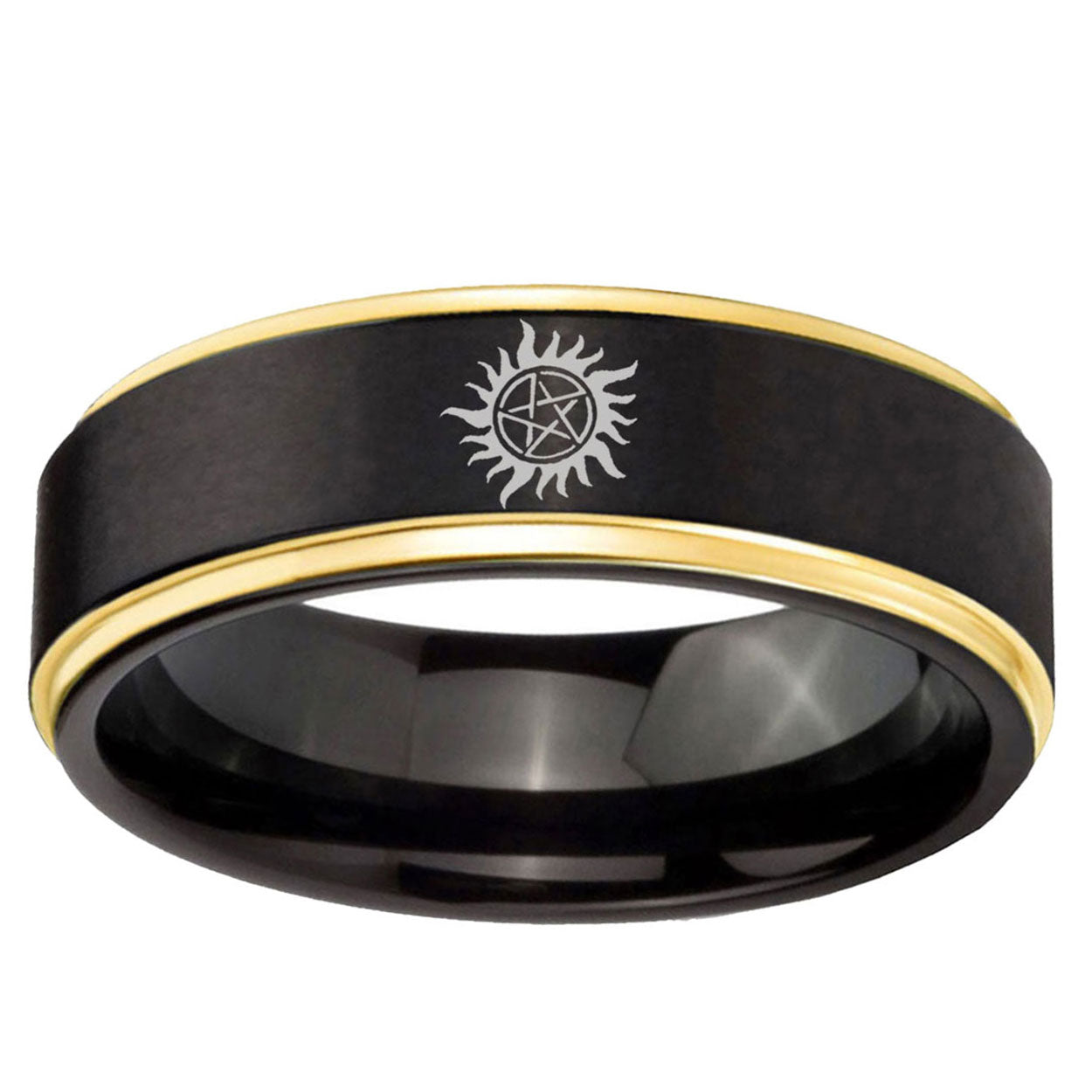 Intruding 6, 8mm Supernatural Step Edge Gold And Black Men's Tungsten Rings . Offer in both 6mm and 8mm band width Gold And Black plated finished from size 5 to 14