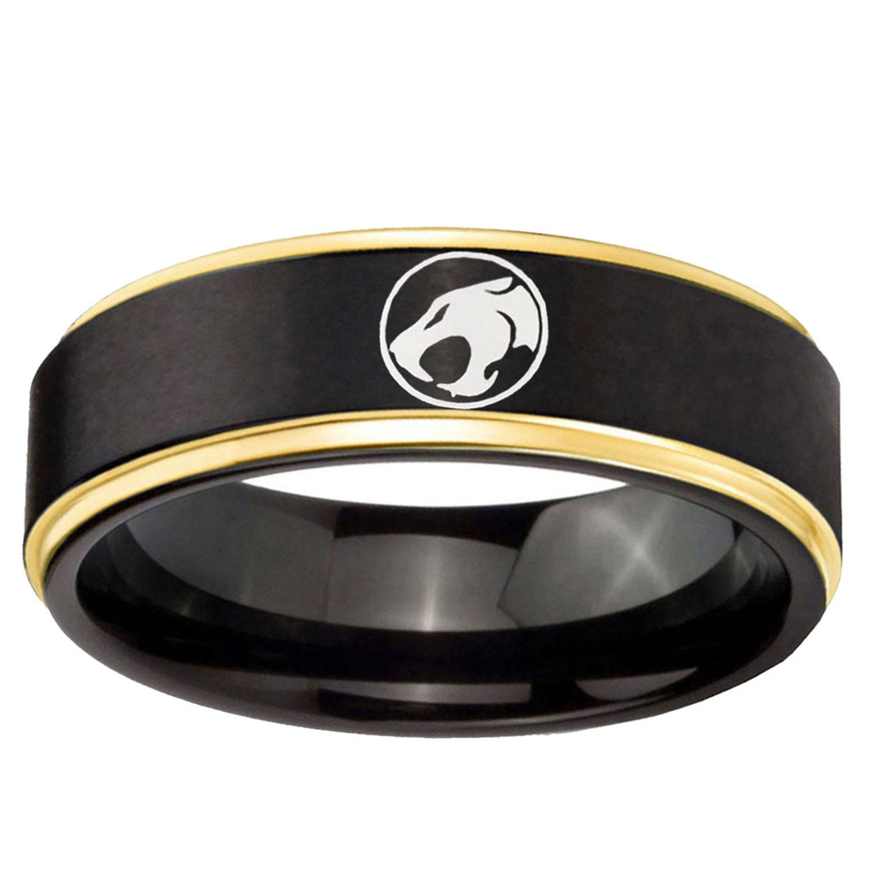 Intruding 6, 8mm Thundercat Gold Step Edge Black Tungsten Carbide Men's Ring . Offer in both 6mm and 8mm band width black plated finished from size 5 to 14