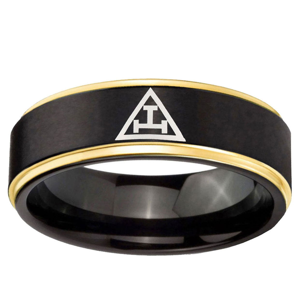 6, 8mm Masonic Triple Gold Step Edge Black Tungsten Men's Ring Personalized