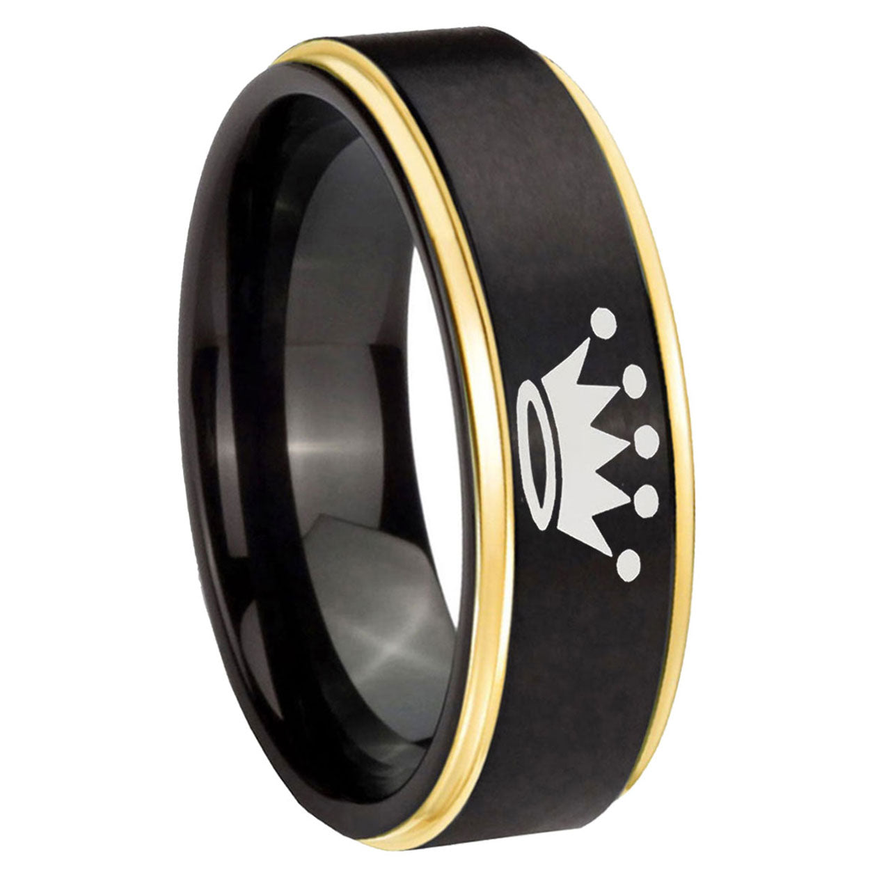 Intruding 6, 8mm Crown Gold Step Edge Black Tungsten Carbide Mens Wedding Ring . Offer in both 6mm and 8mm band width black plated finished from size 5 to 14