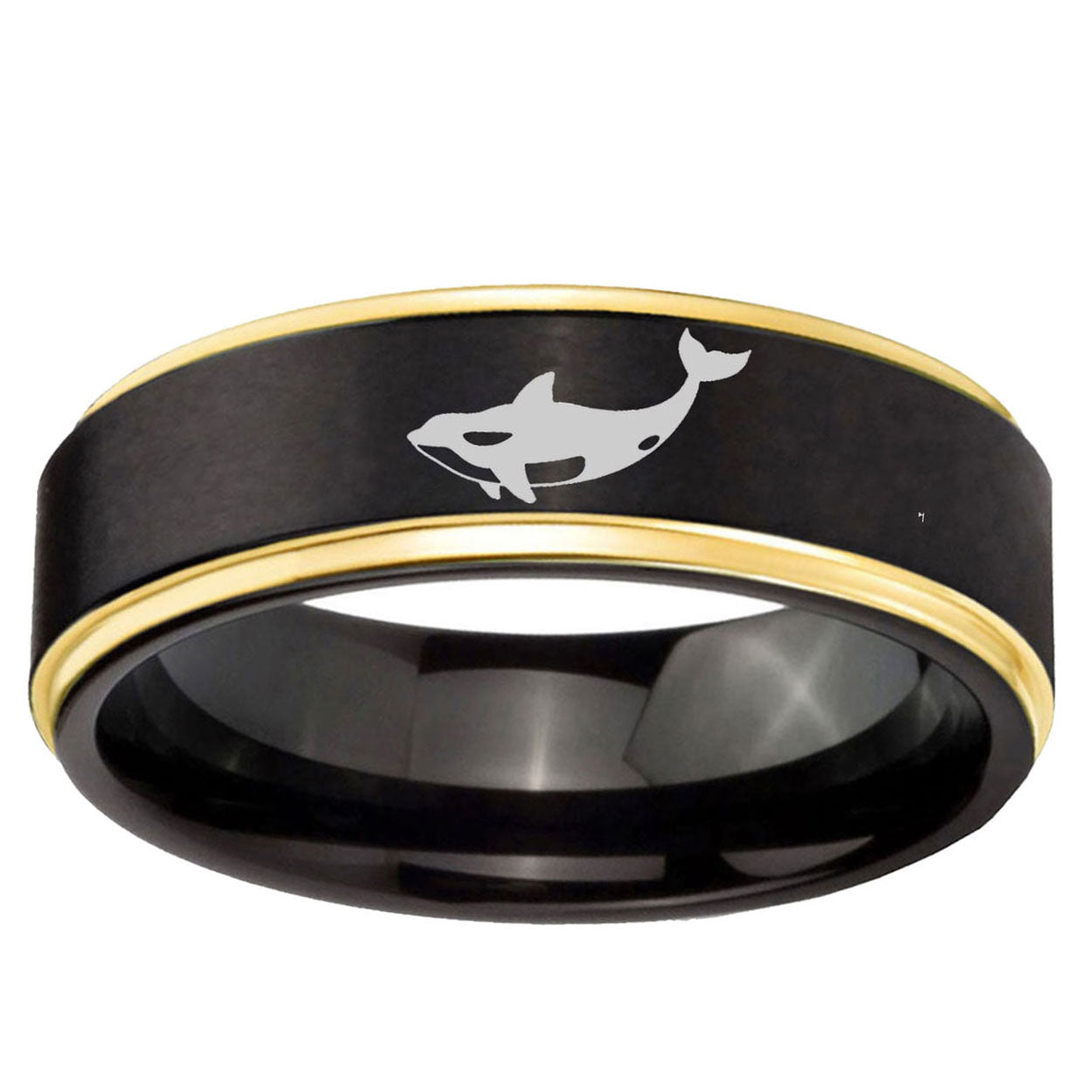 Intruding 6, 8mm Keller Whale Gold Step Edges Tungsten Carbide Men's Wedding Ring . Offer in both 6mm and 8mm band width Gold And Black plated finished from size 5 to 14