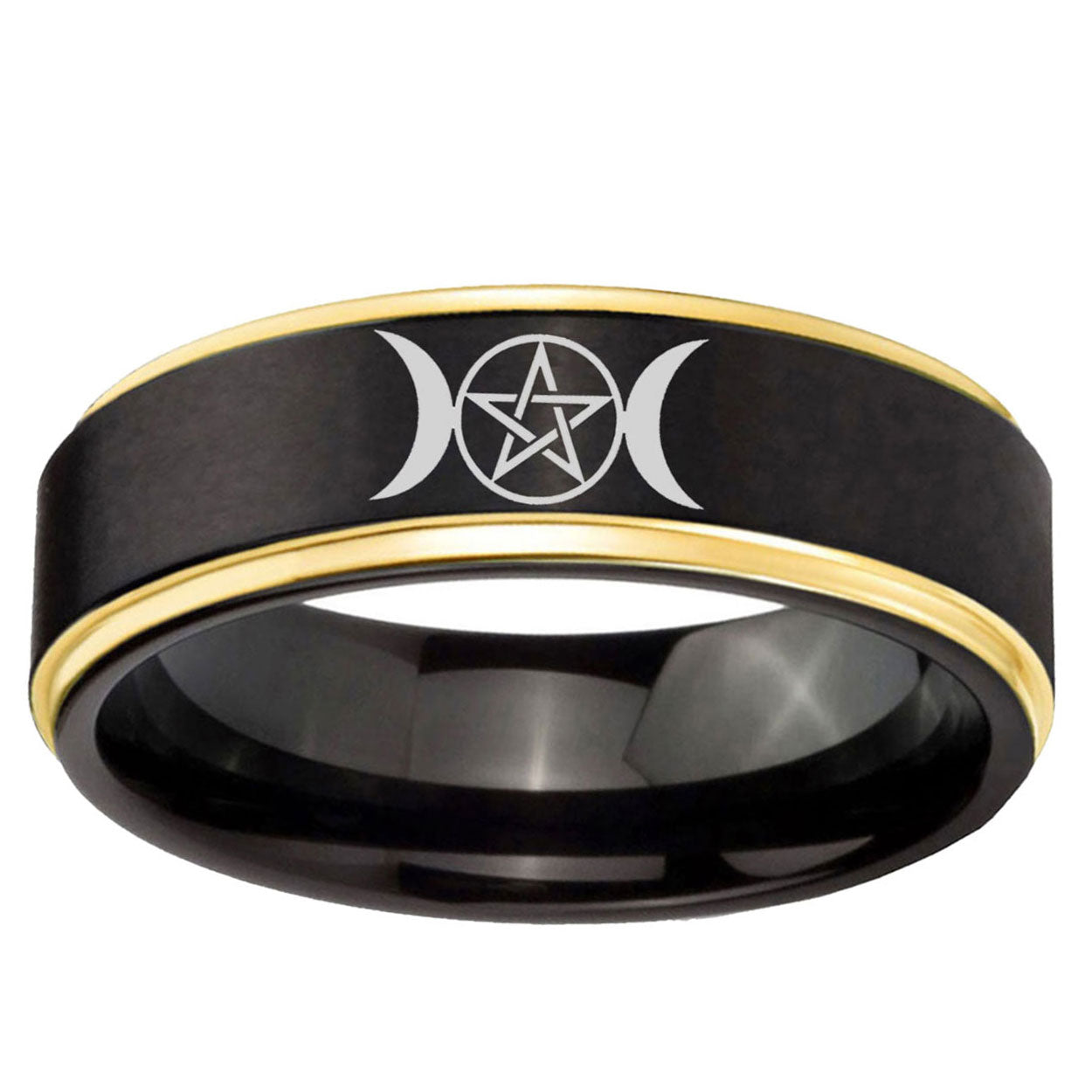 Intruding 6, 8mm Triple Moon Gold Step Edges Tungsten Carbide Men's Wedding Ring . Offer in both 6mm and 8mm band width Gold And Black plated finished from size 5 to 14