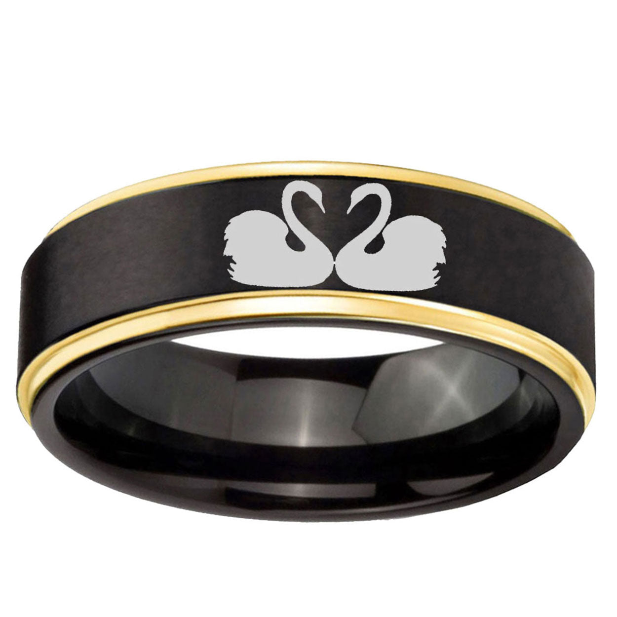 6, 8mm Swans Design Gold Step Edge Black Tungsten Carbide Wedding Ring