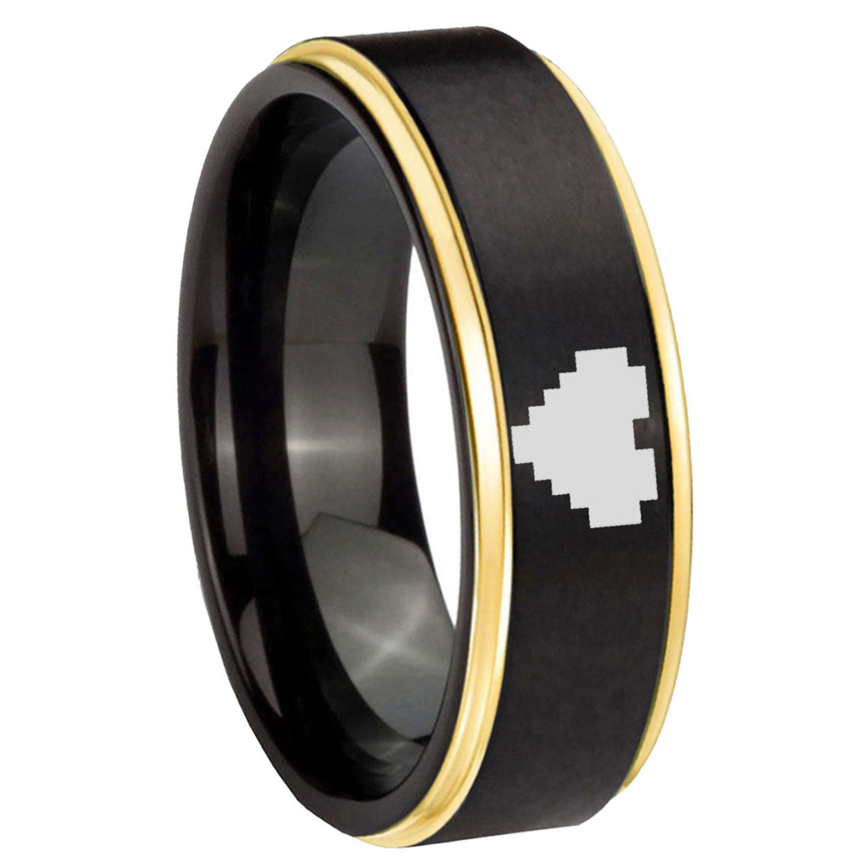 6, 8mm Gold Step Edge Black Zelda Heart Tungsten Carbide Laser Engraved Ring