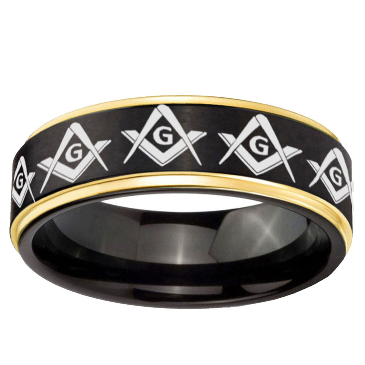 Intruding 6, 8mm Masonic Square and Compass Gold Step Edges Tungsten Carbide Men's Wedding Ring . Offer in both 6mm and 8mm band width Gold And Black plated finished from size 5 to 14