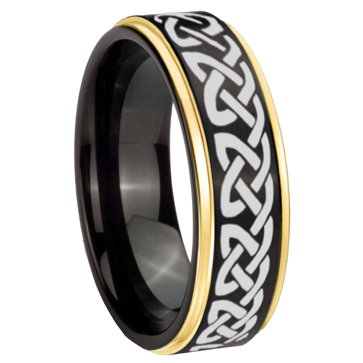 Intruding 6, 8mm Celtic Knot Love Gold Step Edges Tungsten Carbide Men's Wedding Ring . Offer in both 6mm and 8mm band width Gold And Black plated finished from size 5 to 14