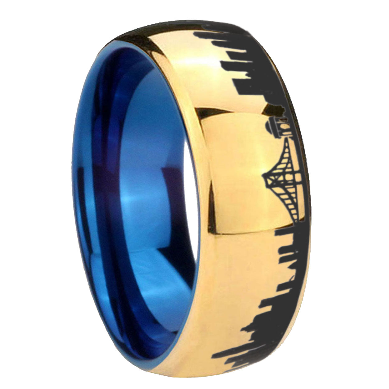 8mm CA San Francisco City Dome Polish Gold Tungsten Blue Plated Inside Mens Ring