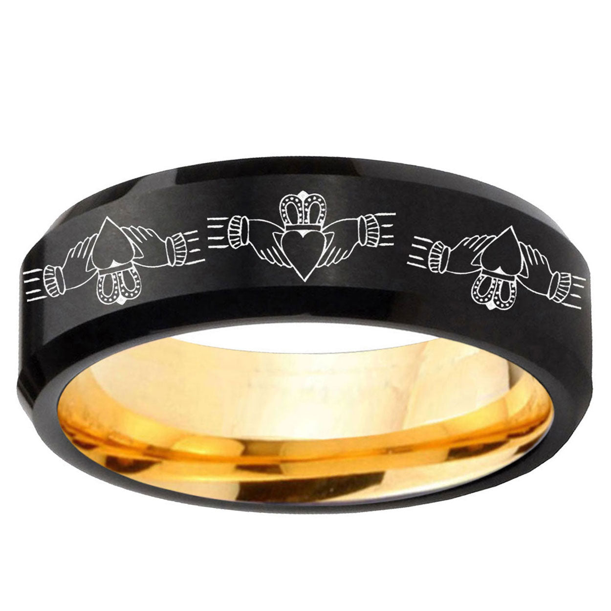 Intruding 8mm Irish Claddagh Beveled Edge Black And Gold Tungsten Carbide Engagement Ring . Offer in men wedding band in 8mm band width black and gold plated finished from size 7 to 14