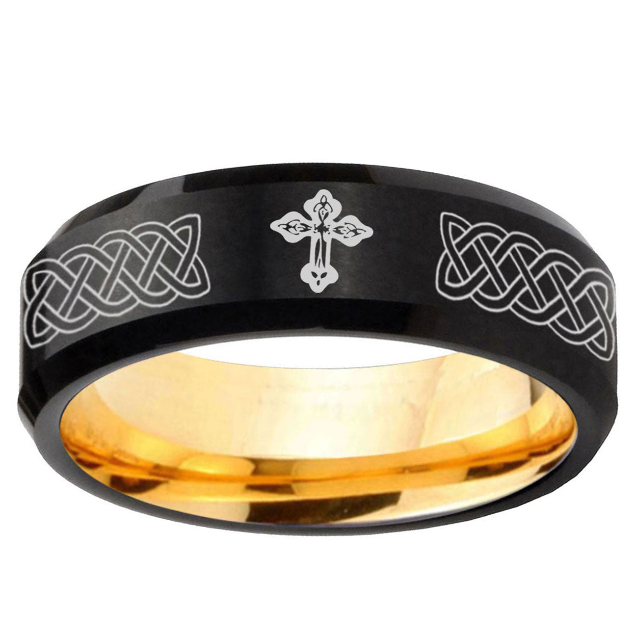 8mm Celtic Cross Beveled Edge Black And Gold Tungsten Carbide Engraved Ring
