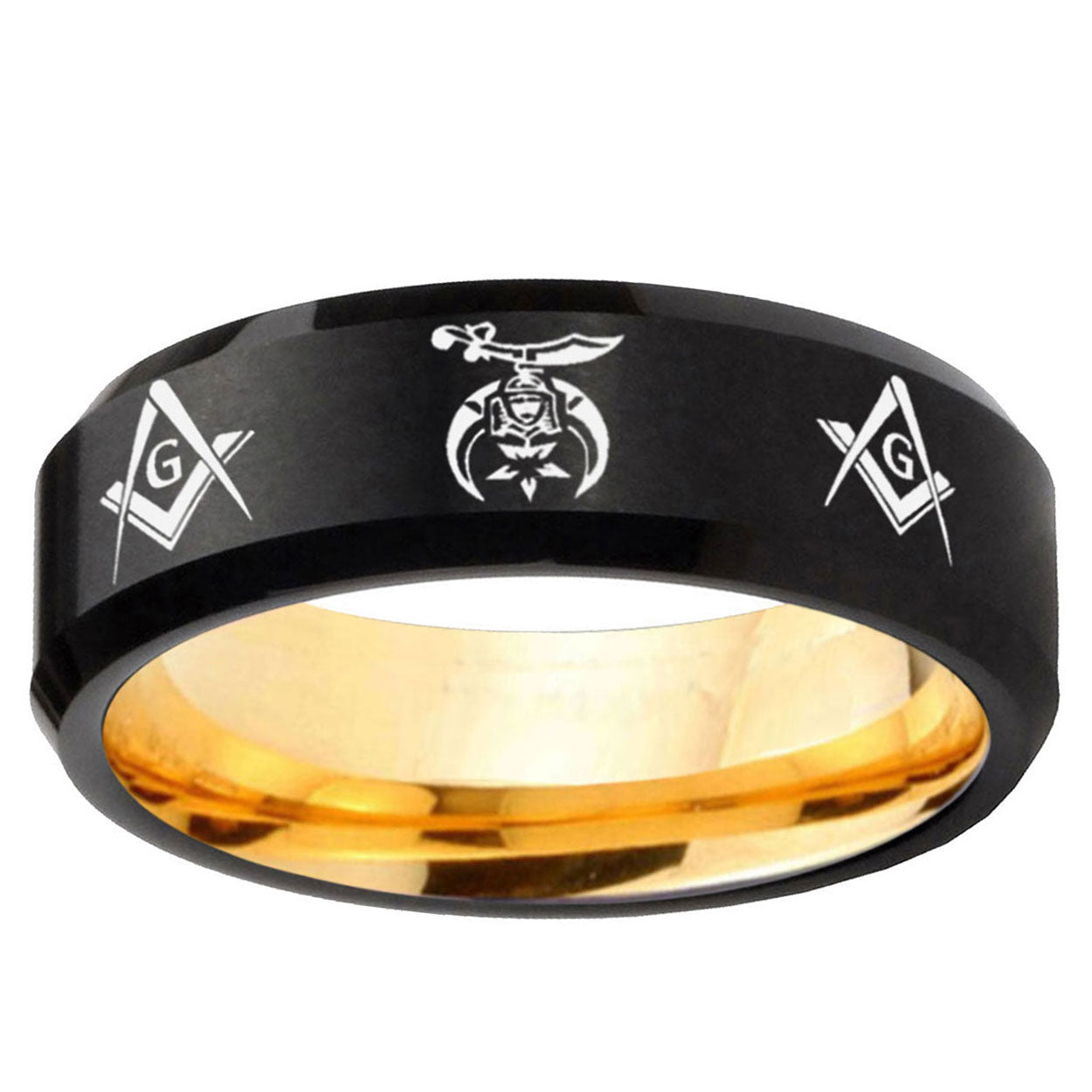 Intruding 8mm Masonic Shriners Beveled Edge Black And Gold Tungsten Carbide Men's Wedding Band . Offer in men wedding band in 8mm band width black and gold plated finished from size 7 to 14