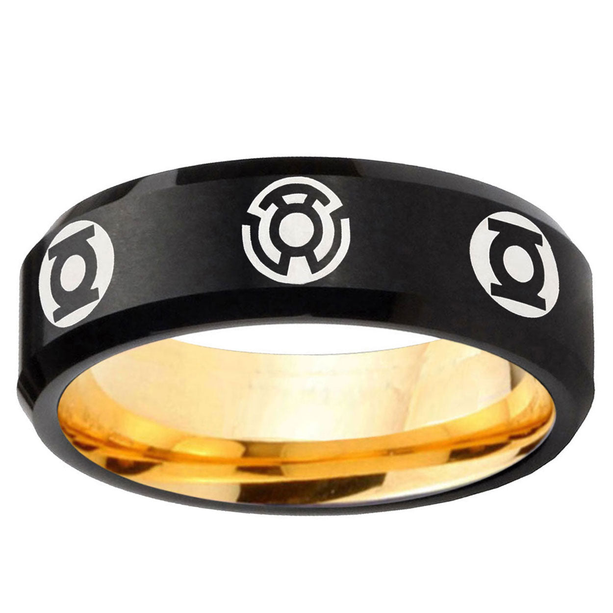 Intruding 8mm Blue Green Lantern Beveled Edge Black And Gold Personalized Tungsten Rings . Offer in men wedding band in 8mm band width black and gold plated finished from size 7 to 14